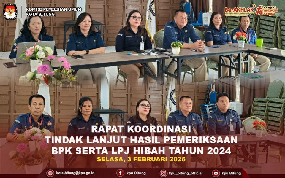 KPU Kota Bitung mengikuti Rapat Koordinasi Tindak Lanjut Hasil Pemeriksaan Badan Pemeriksa Keuangan (BPK) serta Laporan Pertanggungjawaban (LPJ) Hibah Tahun 2024 yang diselenggarakan oleh KPU Provinsi Sulawesi Utara. Kegiatan ini bertujuan untuk memperkuat koordinasi dalam menindaklanjuti hasil pemeriksaan BPK, sekaligus memastikan penyusunan dan penyampaian LPJ Hibah Tahun 2024 berjalan sesuai dengan ketentuan peraturan perundang-undangan yang berlaku. Melalui rapat koordinasi ini, diharapkan seluruh jajaran KPU kabupaten/kota, termasuk KPU Kota Bitung, dapat meningkatkan akuntabilitas, transparansi, dan tertib administrasi dalam pengelolaan anggaran. Selasa, 3 Februari 2026 ....