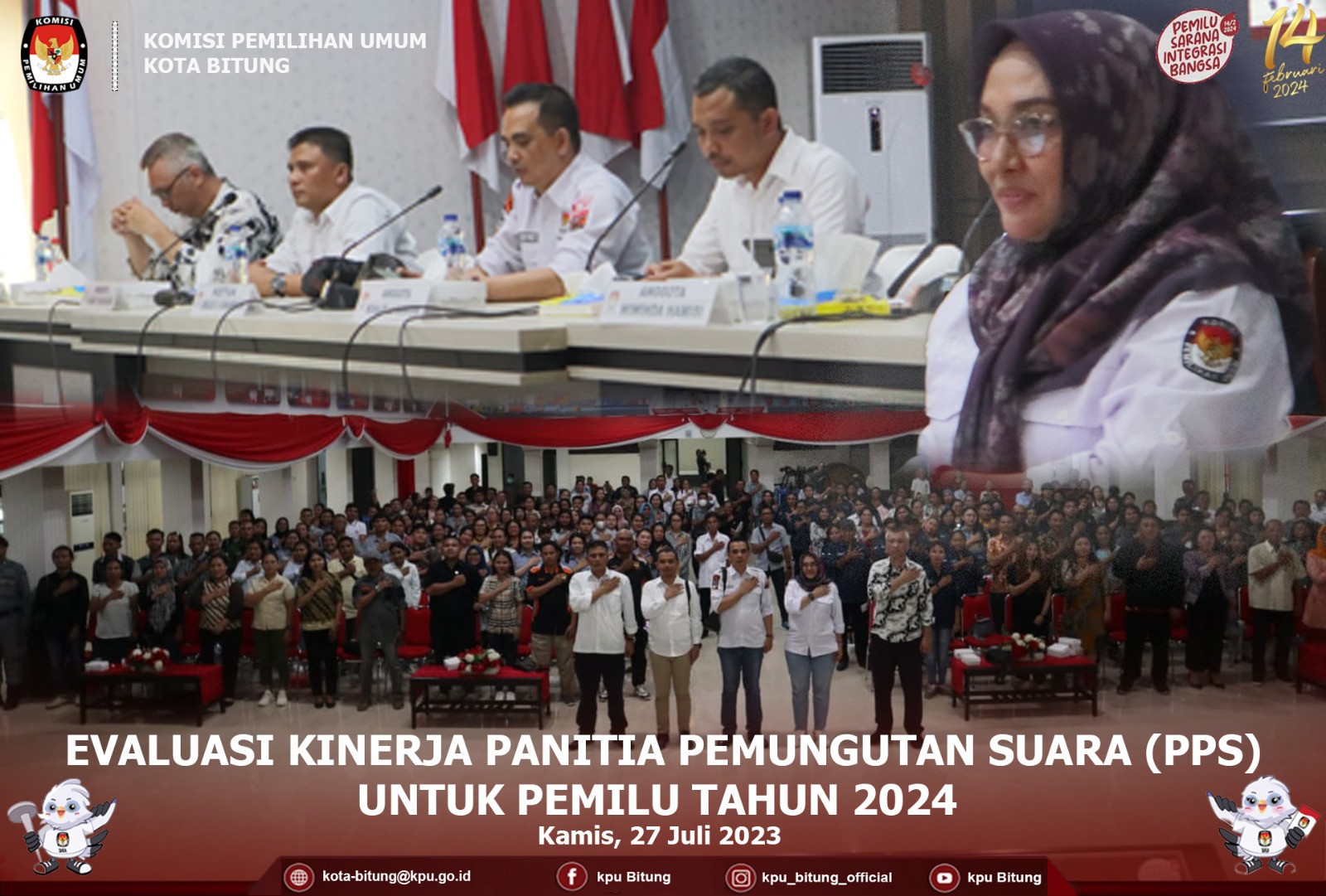 Ketua KPU Kota Bitung Delsie D. Sumampouw, didampingi oleh Anggota KPU Kota Bitung Wiwinda Hamisi, Muhajir La Djanudin, Frangky Takasihaeng, dan Yunnoy S. Rawung membuka Rapat Evaluasi Kinerja Panitia Pemungutan Suara (PPS) Se-Kota Bitung Untuk Pemilihan Umum Tahun 2024. Kamis, 27 Juli 2023, Pukul 14 :00 Wita, bertempat di Ruang S.H Sarundajang (BPU) Kantor Walikota Bitung,