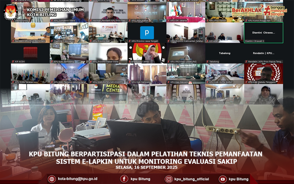 Komisi Pemilihan Umum (KPU) Kota Bitung turut serta dalam kegiatan Pelatihan Teknis mengenai pemanfaatan sistem E-Lapkin untuk keperluan monitoring tindak lanjut evaluasi Sistem Akuntabilitas Kinerja Instansi Pemerintah (SAKIP), yang berlangsung pada Selasa, 16 September 2025.