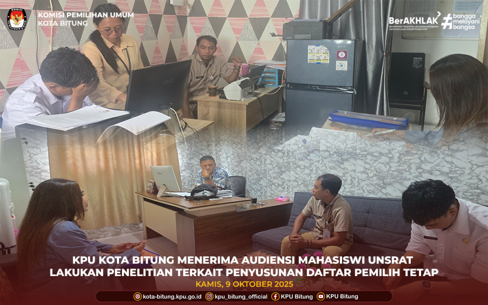 KPU Kota Bitung menjadi lokasi penelitian bagi seorang mahasiswi dari Universitas Sam Ratulangi Manado, program studi Ilmu Pemerintahan, bernama Elsa Sophia Pondete. Penelitian ini dilakukan sebagai bagian dari penyusunan skripsinya yang berjudul “Kinerja KPU Kota Bitung Dalam Penyusunan Daftar Pemilih Tetap Pada Pemilihan Kepala Daerah Tahun 2024.”