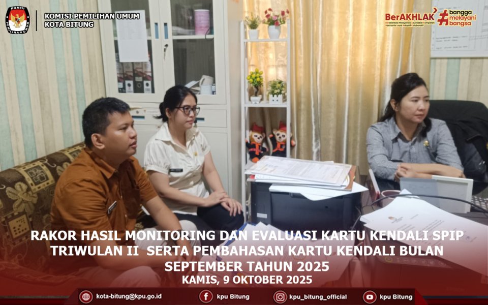 Komisi Pemilihan Umum (KPU) Kota Bitung mengikuti Rapat Koordinasi (Rakor) terkait hasil Monitoring dan Evaluasi Kartu Kendali SPIP Triwulan II serta pembahasan Kartu Kendali bulan September tahun 2025 yang diselenggarakan oleh KPU Provinsi Sulawesi Utara. Kegiatan ini diikuti oleh seluruh jajaran KPU kabupaten/kota se-Sulawesi Utara dan dilaksanakan dalam rangka memperkuat pelaksanaan Sistem Pengendalian Intern Pemerintah (SPIP) di lingkungan KPU.