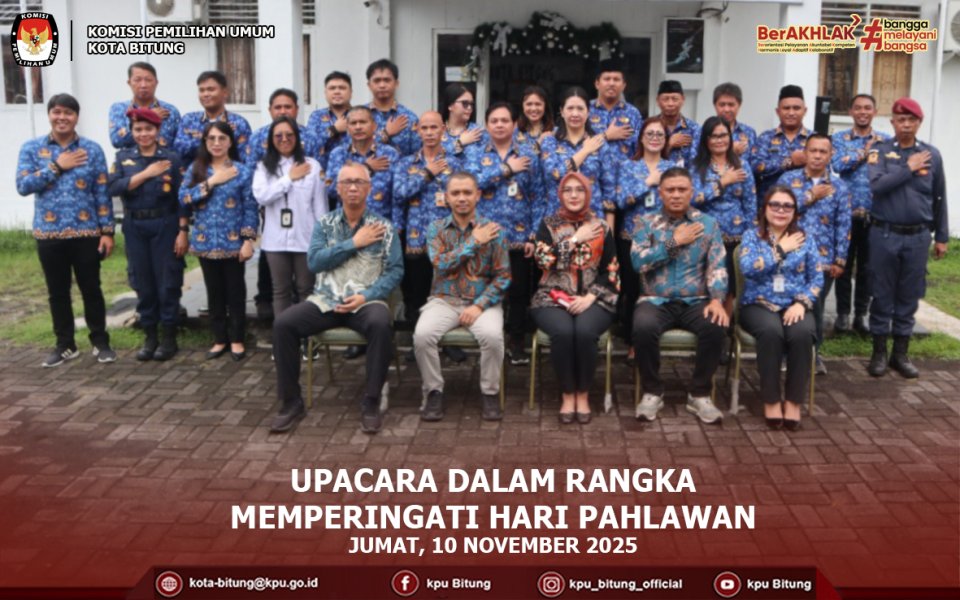KPU Kota Bitung melaksanakan Upacara Memperingati Hari Pahlawan di halaman kantor KPU Bitung dengan khidmat dan penuh penghormatan terhadap jasa para pahlawan bangsa. Bertindak sebagai Pembina Upacara, Ketua Divisi Sosialisasi Pendidikan Pemilih, Partisipasi Masyarakat dan SDM, Wiwinda Hamisi, yang dalam amanatnya membacakan pidato Menteri Sosial tentang pentingnya meneladani semangat juang para pahlawan serta meneruskan nilai‐nilai pengabdian dalam pelaksanaan tugas kerja kita.