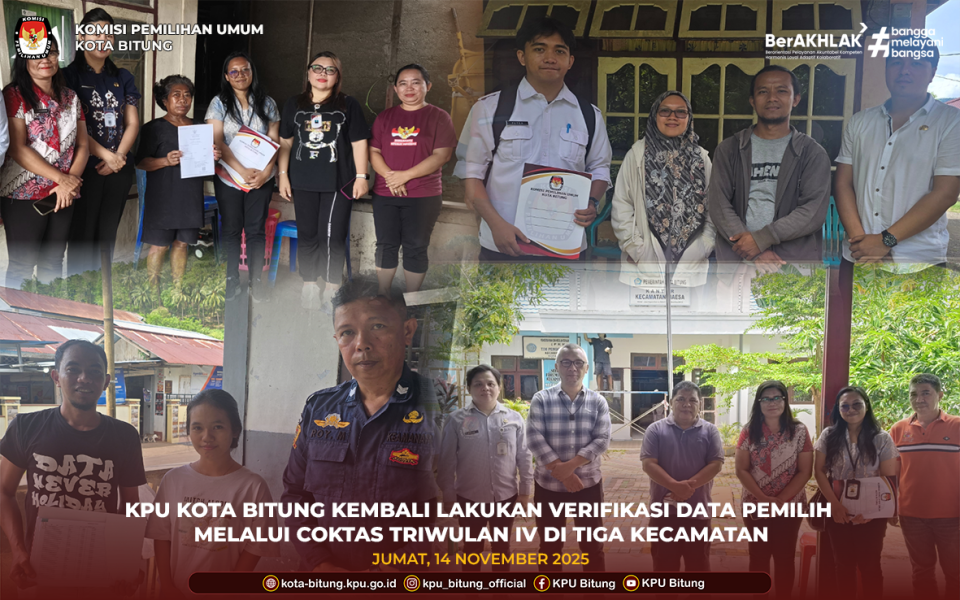 Komisi Pemilihan Umum (KPU) Kota Bitung melaksanakan kegiatan Pencocokan dan Penelitian Terbatas (Coktas) Triwulan IV pada Jumat, 14 November 2025. Pelaksanaan ini difokuskan di tiga kecamatan, yaitu Maesa, Lembeh Utara, dan Lembeh Selatan. Kegiatan Coktas merupakan bagian dari upaya KPU Kota Bitung untuk menjamin akurasi dan kualitas Daftar Pemilih Tetap (DPT) melalui verifikasi lapangan terhadap Data Tidak Memenuhi Syarat (TMS) serta data pemilih yang tercatat dalam data Kementerian Luar Negeri (Kemenlu).