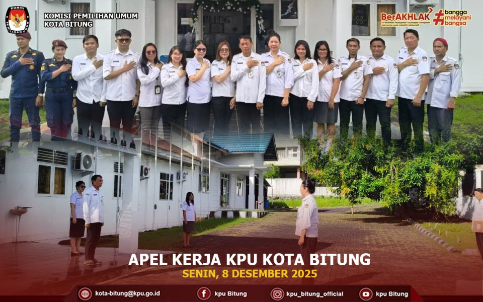 Apel pagi KPU Kota Bitung pada hari ini dilaksanakan di halaman Kantor KPU Kota Bitung dengan penuh kedisiplinan dan kekhidmatan. Seluruh jajaran sekretariat dan pegawai KPU Kota Bitung hadir mengikuti rangkaian kegiatan yang diawali dengan laporan pemimpin apel.
