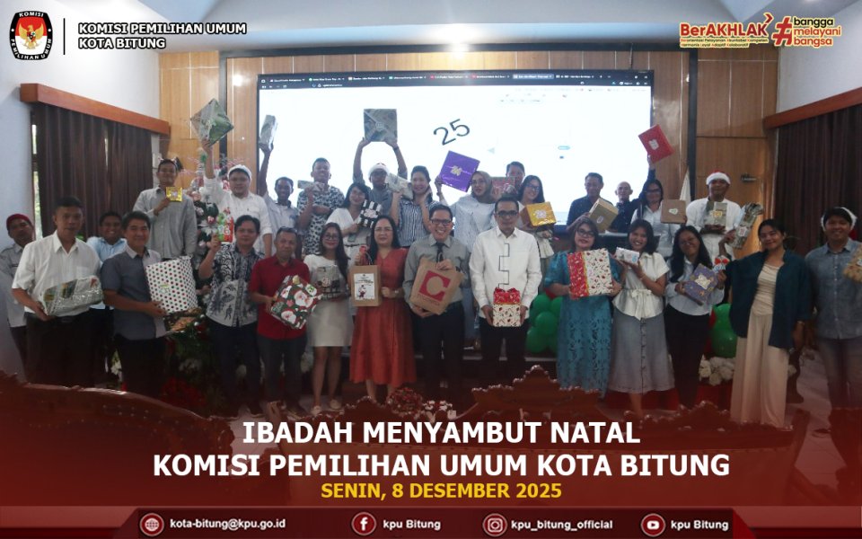 Ibadah Perayaan Menyambut Natal KPU Kota Bitung berlangsung khidmat di Aula Kantor KPU Kota Bitung. Seluruh komisioner, sekretariat, serta staf KPU hadir dalam suasana penuh sukacita. Menariknya, dalam momen penuh kebersamaan ini, para komisioner dan staf yang bukan beragama Kristen juga turut hadir dan merayakan sebagai bentuk solidaritas serta wujud nyata nilai kebhinekaan di lingkungan KPU Kota Bitung.