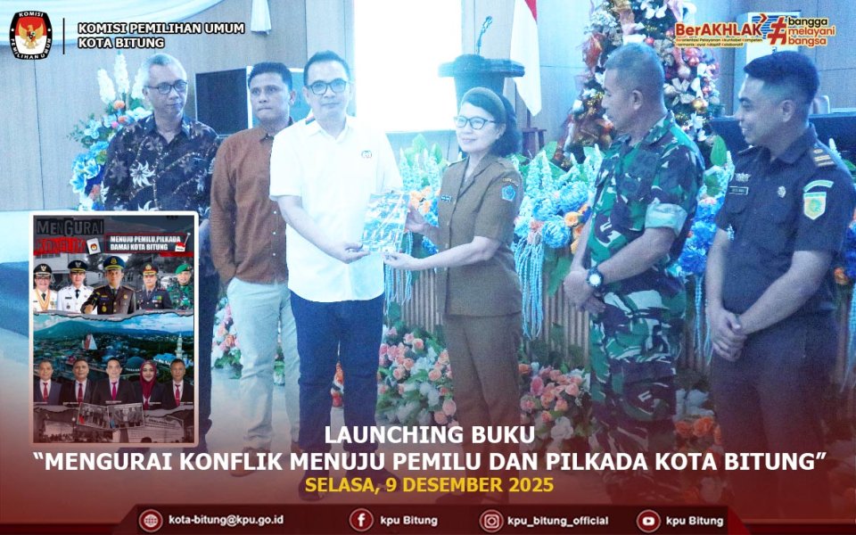 Komisi Pemilihan Umum (KPU) Kota Bitung resmi melaksanakan Launching Buku berjudul “Mengurai Konflik Menuju Pemilu dan Pilkada Kota Bitung” yang digelar di Aula Kantor Wali Kota Bitung. Kegiatan ini menjadi momentum penting dalam memperkuat literasi demokrasi serta mendorong penyelenggaraan pemilu dan pilkada yang lebih damai, inklusif, dan berkualitas di Kota Bitung.