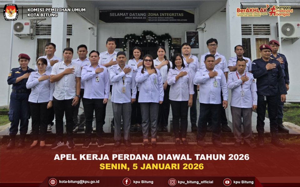 Komisi Pemilihan Umum (KPU) Kota Bitung melaksanakan apel kerja pada minggu pertama Tahun 2026 yang bertempat di halaman Kantor KPU Kota Bitung. Apel kerja ini diikuti oleh seluruh jajaran sekretariat KPU Kota Bitung sebagai bentuk komitmen bersama dalam mengawali pelaksanaan tugas dan tanggung jawab di awal tahun kerja.
