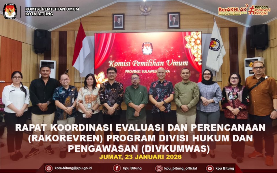 KPU Kota Bitung ikuti Rapat Koordinasi Evaluasi dan Perencanaan (Rakorevren) Program Divisi Hukum dan Pengawasan (Divkumwas) KPU Se- Sulut sekaligus pemberian penghargaan untuk JDIH, SPIP, SAKIP dan LHKPN Kab Kota Terbaik tahun 2025, yang digelar secara hybrid, Jumat 23 Januari 2026.