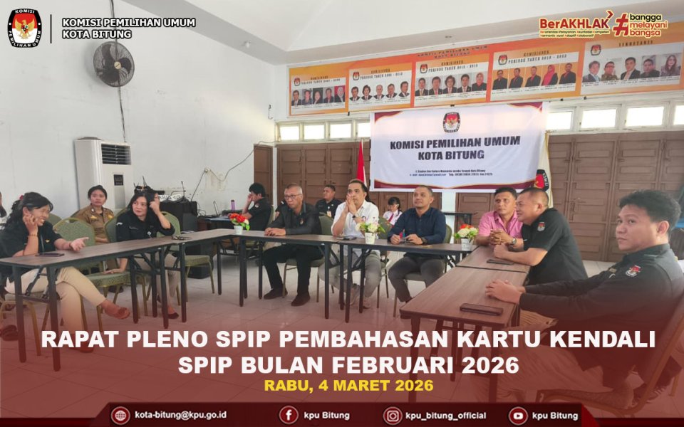 Dalam rangka memperkuat Sistem Pengendalian Intern Pemerintah (SPIP), KPU Kota Bitung menyelenggarakan Rapat Pleno Kartu Kendali SPIP pada Rabu (04/03/2026) bertempat di Aula Kantor KPU Kota Bitung. Kegiatan ini dihadiri dan dibuka secara langsung oleh Ketua KPU Kota Bitung didampingi oleh Anggota KPU Kota Bitung dan dihadiri oleh Sekretariat KPU Kota Bitung.