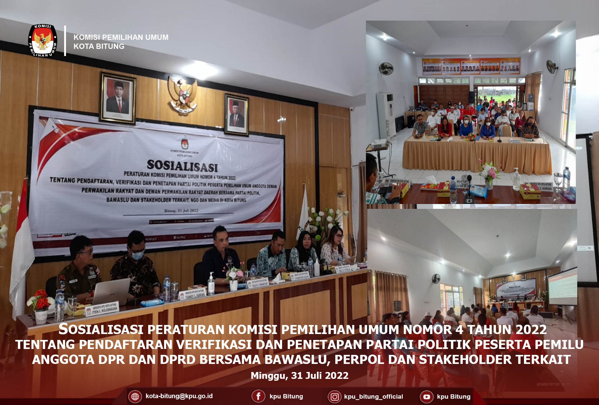 #TemanPemilih, KPU Kota Bitung melaksanakan Sosialisasi Peraturan KPU Nomor 4 Tahun 2022 Tentang Pendaftaran, Verifikasi, dan Penetapan Partai Politik Peserta Pemilihan Umum Anggota Dewan Perwakilan Rayat dan Dewan Perwakilan Rakyat Daerah bersama Partai Politik, Bawaslu, dan Stakeholder terkait.
