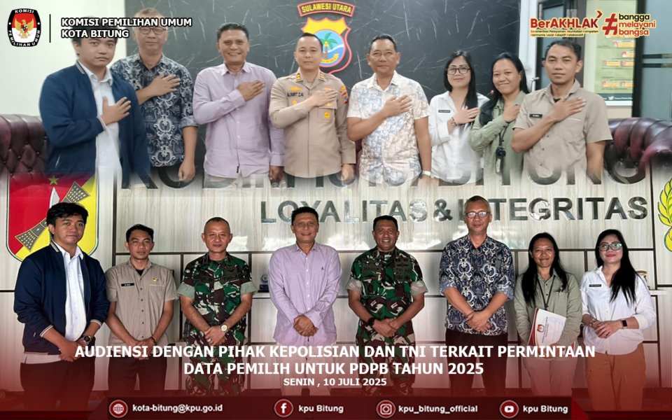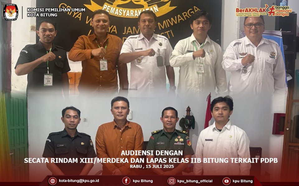Bitung — Komisi Pemilihan Umum (KPU) Kota Bitung melaksanakan audiensi dalam rangka Pemutakhiran Data Pemilih Berkelanjutan (PDPB) ke dua lembaga strategis, yakni Secata Rindam XIII/Merdeka dan Lapas Kelas IIB Bitung, pada Rabu (16/7/2025). Rombongan dipimpin oleh Ketua Divisi Perencanaan, Data dan Informasi KPU Kota Bitung, Frangky Takasihaeng, didampingi dua staf KPU. Kunjungan pertama berlangsung pukul 09.00 WITA ke Secata Rindam XIII/Merdeka, dan disambut oleh Letda Inf Hartono Bisma, selaku Paur Pam Secata. Audiensi membahas data warga Kota Bitung yang telah diangkat menjadi prajurit aktif — yang secara hukum tidak memiliki hak pilih — serta pendataan prajurit yang telah atau akan memasuki masa pensiun. Informasi ini penting agar tidak terjadi kekeliruan dalam pencatatan daftar pemilih. “Koordinasi seperti ini sangat diperlukan. Kami mendukung agar data prajurit, baik aktif maupun purnawirawan, bisa terakomodasi sesuai aturan,” ujar Letda Inf Hartono Bisma. Pukul 10.30 WITA, KPU Bitung melanjutkan kunjungan ke Lapas Kelas IIB Bitung. Rombongan disambut terlebih dahulu oleh Kasubsi Registrasi dan Bimbingan Kemasyarakatan, P. B. Christofer Lewerissa, sebelum kemudian bertemu langsung dengan Kalapas, Edi Kuhen. Audiensi difokuskan pada pemutakhiran data pemilih warga binaan asal Kota Bitung yang masih memenuhi syarat memilih. Kunjungan ini bersifat internal dan tidak melibatkan warga binaan secara langsung, namun menjadi bagian penting dari langkah KPU menjangkau seluruh kelompok masyarakat. “Kami siap mendukung pendataan yang dilakukan KPU. Ini penting agar hak pilih warga binaan tetap dihormati,” kata Edi Kuhen. Ketua Divisi Perencanaan, Data dan Informasi KPU Bitung, Frangky Takasihaeng, menegaskan bahwa kunjungan ini adalah bentuk nyata komitmen KPU untuk menjaga akurasi data pemilih secara menyeluruh. “Kami ingin memastikan bahwa seluruh warga Kota Bitung yang memenuhi syarat, baik di lingkungan militer maupun pemasyarakatan, terdata dengan baik dan benar dalam daftar pemilih,” ujarnya