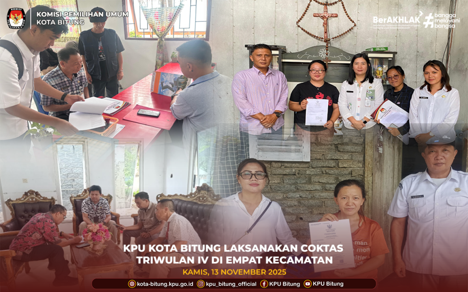Komisi Pemilihan Umum (KPU) Kota Bitung melaksanakan kegiatan Pencocokan dan Penelitian Terbatas (Coktas) Triwulan IV pada Jumat, 14 November 2025. Pelaksanaan ini difokuskan di tiga kecamatan, yaitu Maesa, Lembeh Utara, dan Lembeh Selatan. Kegiatan Coktas merupakan bagian dari upaya KPU Kota Bitung untuk menjamin akurasi dan kualitas Daftar Pemilih Tetap (DPT) melalui verifikasi lapangan terhadap Data Tidak Memenuhi Syarat (TMS) serta data pemilih yang tercatat dalam data Kementerian Luar Negeri (Kemenlu). Pelaksanaan Coktas diawali dengan koordinasi bersama pihak kecamatan dan kelurahan untuk menyampaikan maksud dan tujuan kegiatan. Selanjutnya, tim melakukan pengecekan langsung ke kantor kelurahan dan rumah warga yang menjadi objek verifikasi, terutama pemilih yang terindikasi telah meninggal dunia maupun pemilih yang disebutkan berada di luar negeri. Di Kecamatan Maesa, kegiatan dipimpin oleh Yunnoy Servulus Rawung, Ketua Divisi Teknis Penyelenggaraan. Berdasarkan hasil verifikasi, tim memastikan tiga orang pemilih telah meninggal dunia, sementara satu pemilih yang tercantum dalam data Kemenlu ternyata masih berdomisili di Kota Bitung dan tidak berada di luar negeri. Sementara itu, kegiatan Coktas di Kecamatan Lembeh Utara dipimpin oleh Wiwinda Hamisi, Ketua Divisi Sosialisasi, Pendidikan Pemilih, Partisipasi Masyarakat, dan SDM. Dari hasil verifikasi, tercatat tiga pemilih dipastikan telah meninggal dunia. Adapun pelaksanaan di Kecamatan Lembeh Selatan dipimpin oleh Frangky Takasihaeng, Ketua Divisi Perencanaan, Data, dan Informasi. Di wilayah ini, tim menemukan dua pemilih yang dipastikan telah meninggal dunia. Melalui kegiatan Coktas Triwulan IV ini, KPU Kota Bitung menegaskan komitmennya dalam menjaga keakuratan dan pemutakhiran data pemilih. Seluruh hasil verifikasi lapangan akan menjadi dasar pembaruan pemilih berkelanjutan, sehingga hanya warga negara yang memenuhi syarat yang tercantum dalam DPT pada Pemilu mendatang.
