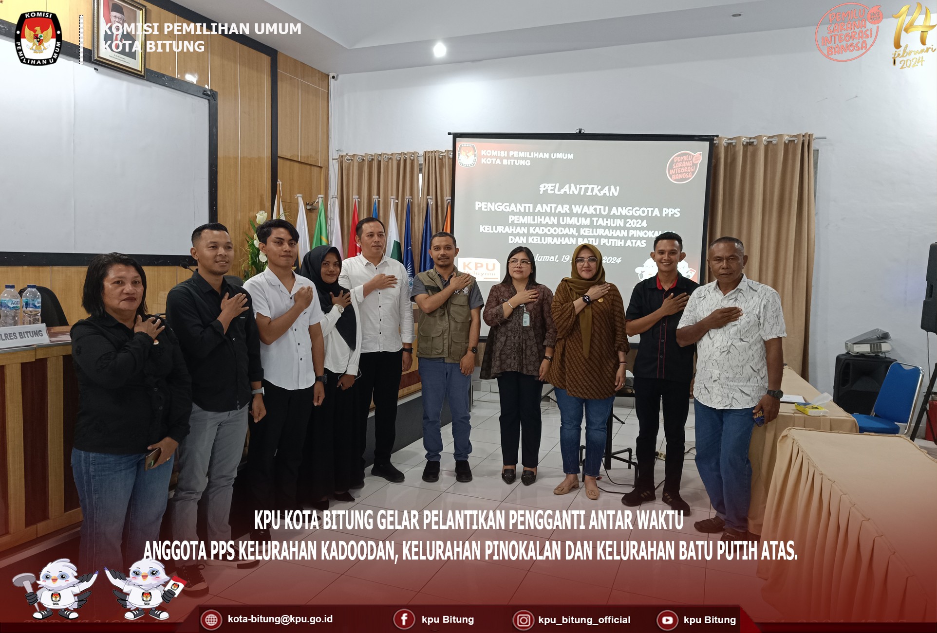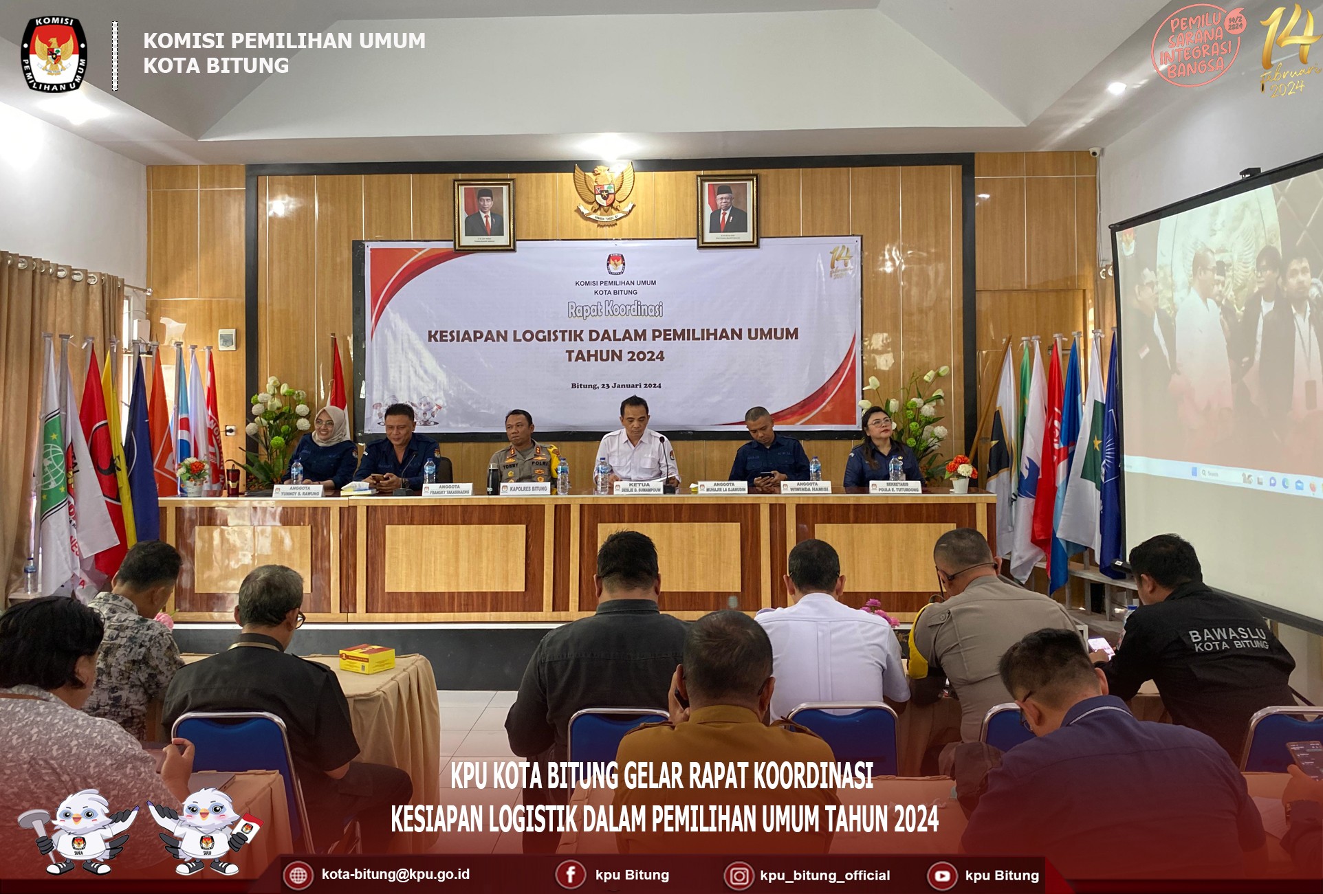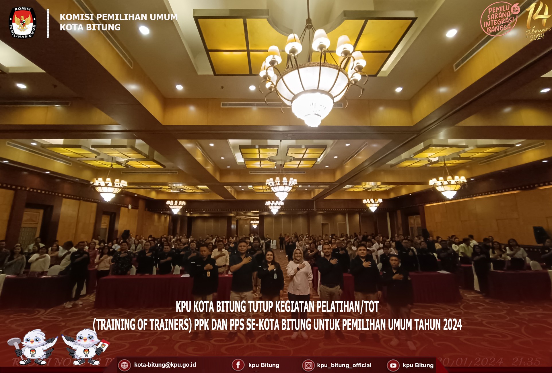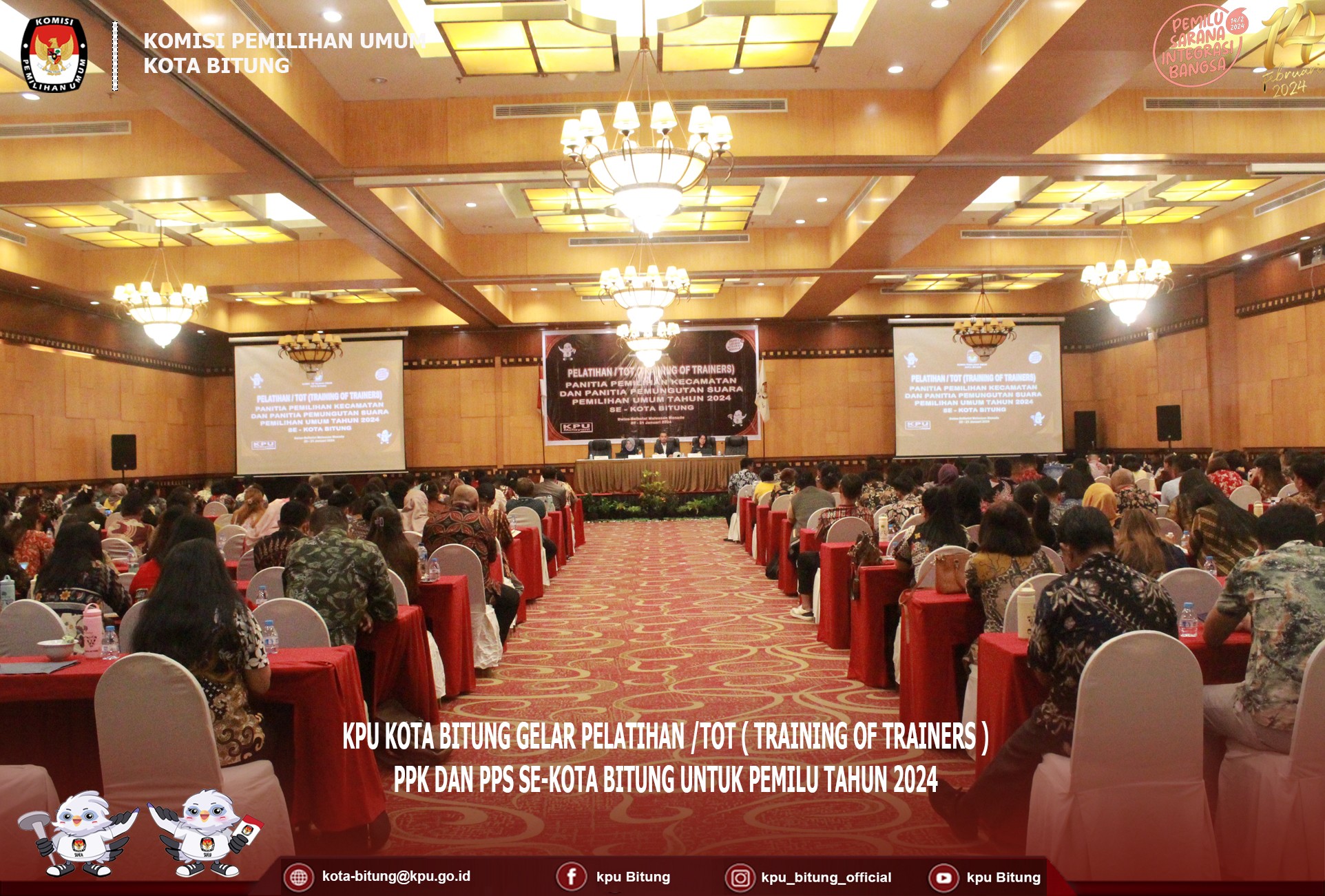 Manado, kota-bitung.kpu.go.id, bertempat di Swiss-Belhotel Manado, KPU Kota Bitung Gelar Pelatihan / TOT ( Training Of Trainers ) PPK dan PPS Se-Kota Bitung, Sabtu 20 Januari 2024. Kegiatan ini dibuka secara langsung oleh Plh. Ketua KPU Bitung Muhajir La Djanudin, didampingi oleh Ketua Divisi Perencanaan Data dan Informasi Frangky Takasihaeng, Ketua Divisi Sosialisasi Pendidikan Pemilih, Partisipasi Masyarakat dan SDM Wiwinda Hamisi, dan Sekretaris KPU Kota Bitung Poula E. Tuturoong, serta dihadiri oleh seluruh PPK dan PPS Se-Kota Bitung. Muhajir juga menekankan bahwa pelatihan ini bukan hanya tentang pengetahuan tapi juga untuk melatih skill dalam pengelolaan forum, dan juga untuk meminimalisir masalah - masalah yang akan dihadapi pada saat pemungutan, pengitungan dan rekapitulasi surat suara. Hal senada juga di ungkapan oleh Ketua Divisi Perencanaan Data dan Informasi Frangky Takasihaeng menekankan kepada PPK dan PPS agar supaya dalam materi yang akan disamapaikan nanti diperhatikan dengan baik agar supaya dalam melakukan bimtek kepada KPPS dapat dimengerti dan dipahami. begitu pun juga dengan Ketua Divisi Sosialisasi Pendidikan Pemilih, Partisipasi Masyrakat dan SDM, wiwinda mengatakan kegiatan ini sangat penting untuk membekali KPPS, karena KPPS adalah ujung tombak dalam Pemungutan, Pengitungan, dari Rekapitulasi pada 14 Februari 2024 mendatang. Setelah mendengarkan sambutan, dan pengarahan dari Anggota Komisioner KPU Kota Bitung, selanjutnya PPK dan PPS dibagi menjadi tiga kelas untuk mengikuti materi. Selanjutnya kegiatan ini dilanjutkan pada besok hari, minggu 21 Januari 2024.