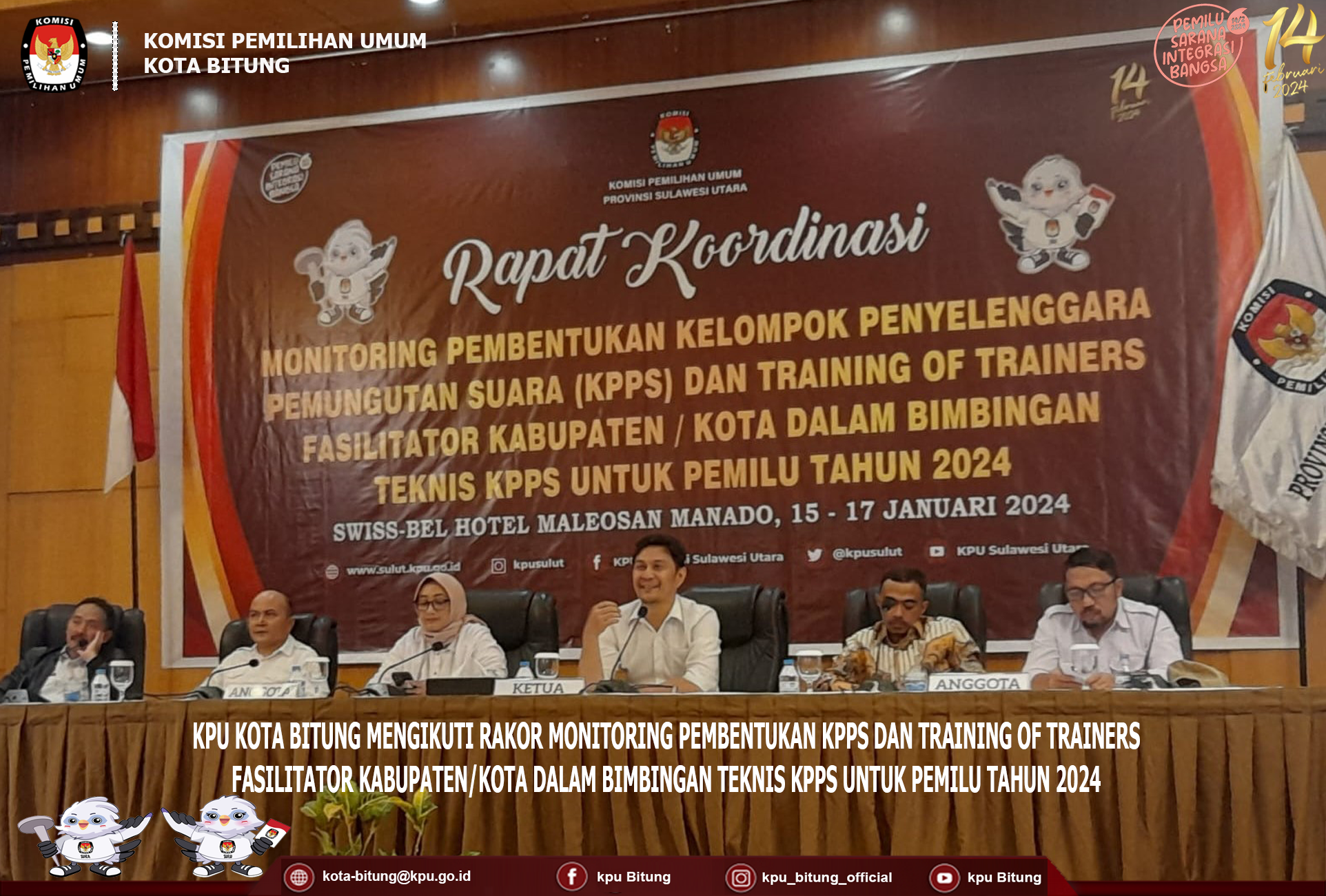 Manado, kota-bitung.kpu.go.id, Bertempat di Swiss - belhotel Manado KPU Kota Bitung mengikuti Rapat Koordinasi Pembentukan KPPS dan Training of Trainers Fasilitator Kabupaten/Kota dalam Bimbingan Teknis KPPS untuk Pemilihan Umum Tahun 2024.