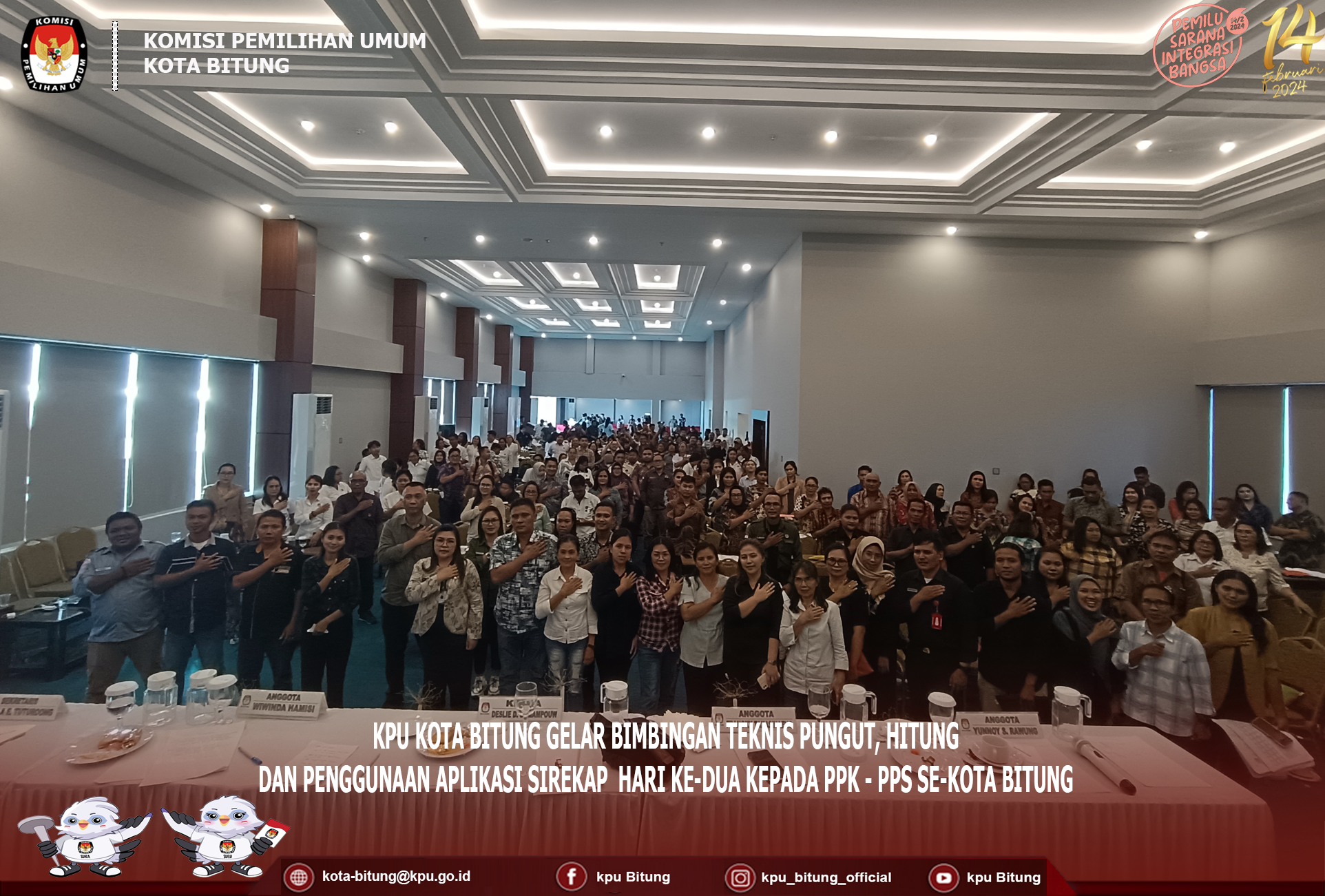 Kegiatan hari kedua ini dibuka secara langsung oleh Ketua KPU Kota Bitung Deslie D. Sumampow, didampigi oleh Anggota Komisioner KPU Kota Bitung, Frangky Takasihaeng, Muhajir La Djainudin, Yunnoy S. Rawung dan Wiwinda Hamisi, dan Sekretaris KPU Kota Bitung Poula E. Tuturoong serta dihadiri oleh Seluruh PPK dan PPS Se-Kota Bitung.