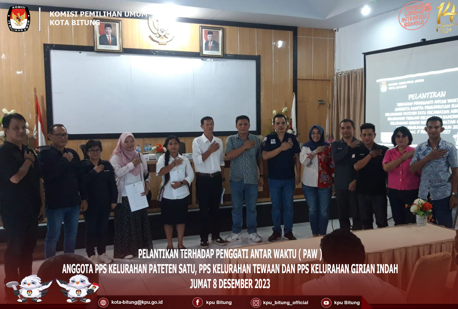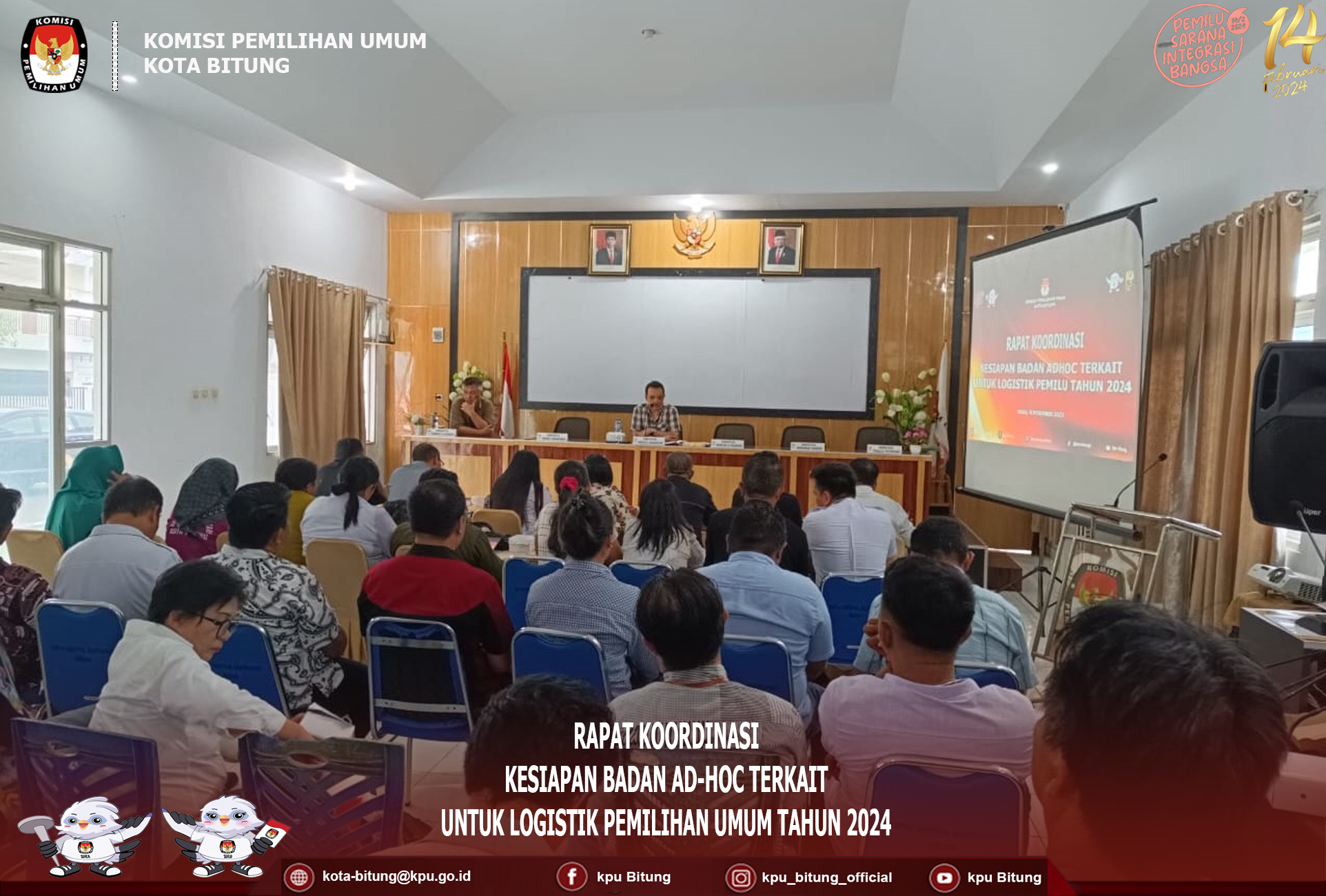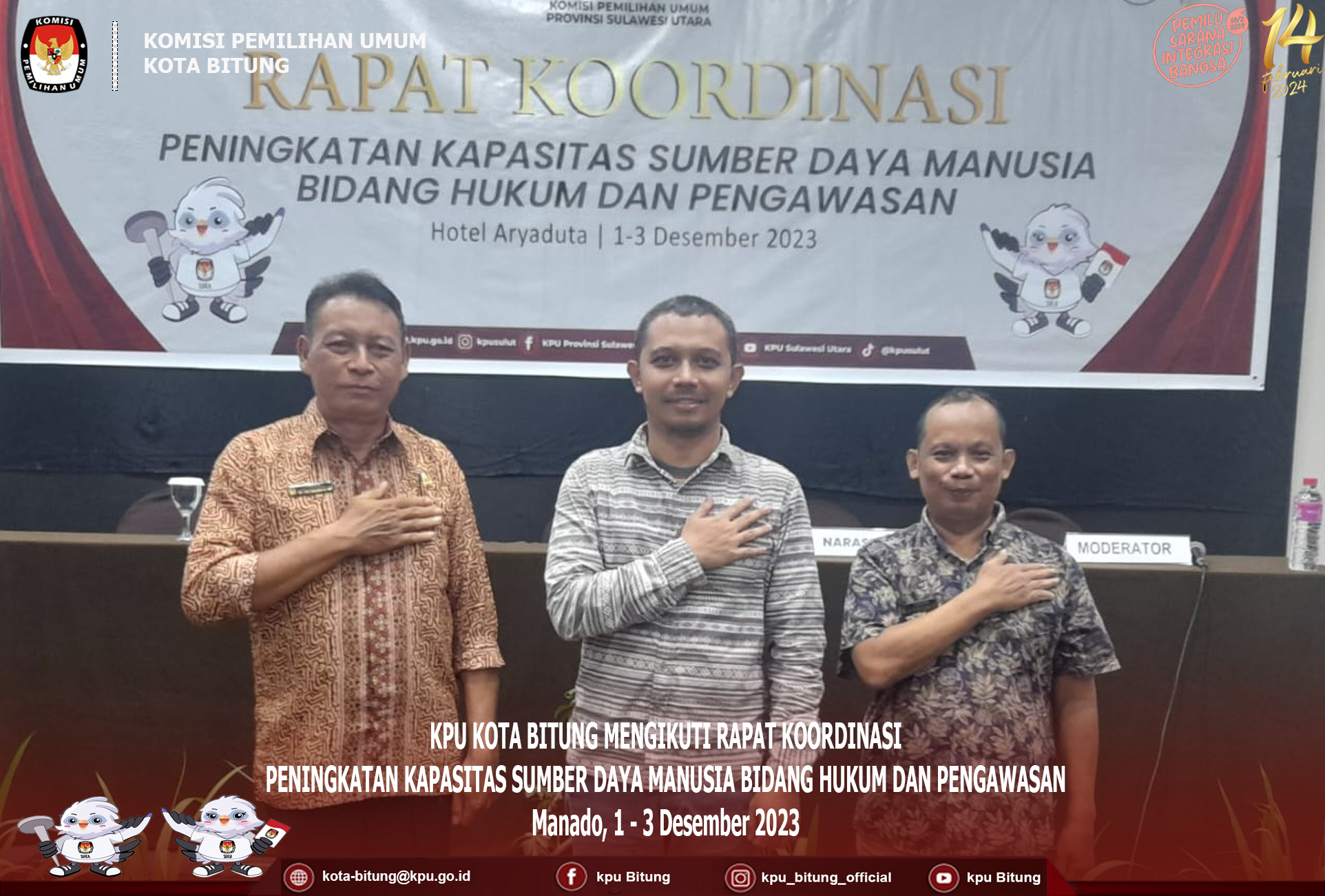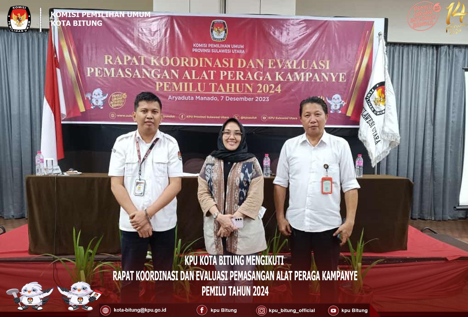 Bitung, kota-bitung.kpu.go.id, di Wakili Oleh Ketua Divisi Sosialisasi Pedidikan Pemilih, Partisipasi Masyarakat dan SDM Wiwinda Hamisi, serta sekretariat KPU Kota Bitung Herling Pitoy dan Meyorits Mandiangan, KPU Kota Bitung mengikuti rapat koordinasi dan evaluasi pemasangan alat peraga kampanye, bertempat di Hotel Aryaduta, Kamis 7 Desember 2023.