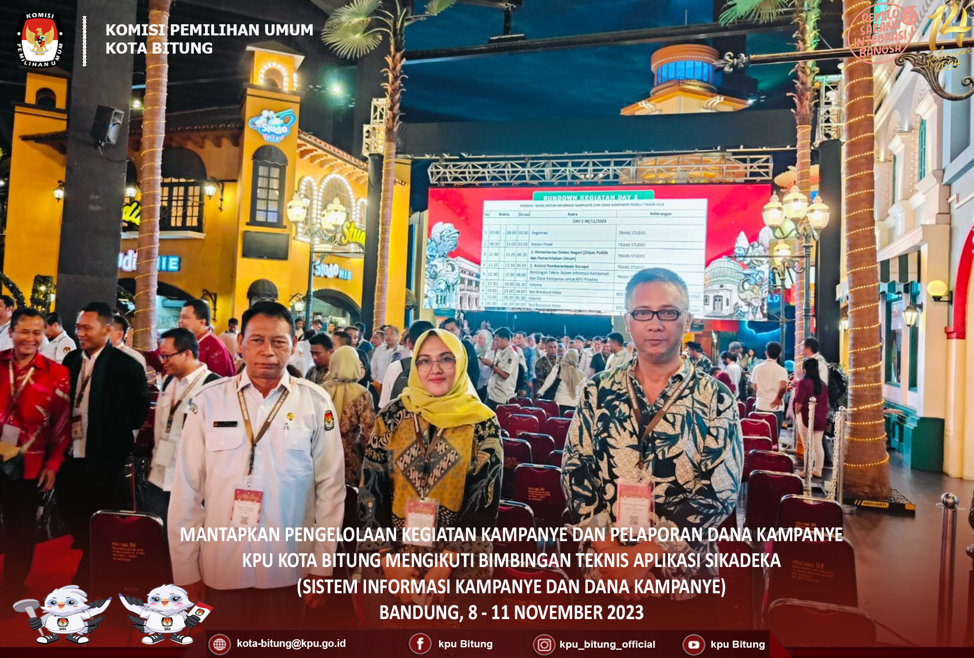 Bitung, kota-bitung.kpu.go.id, demi memantapkan pengelolaan kegiatan kampanye KPU Kota Bitung yang diwakili oleh Ketua Divisi Teknis Penyelenggaraan Yunnoy S. Rawung, Ketua Divisi Sosialisasi Pendidikan Pemilih, Partsipasi Masyarakat dan SDM Wiwinda Hamisi, Serta Operator SIKADEKA Felix Ansyu, mengkuti Bimbingan Teknis Aplikasi SIKADEKA (Sistem Informasi Kampanye dan Dana Kampanye ) Pemilu Tahun 2024, di Bandung, 8 - 11 November 2023.