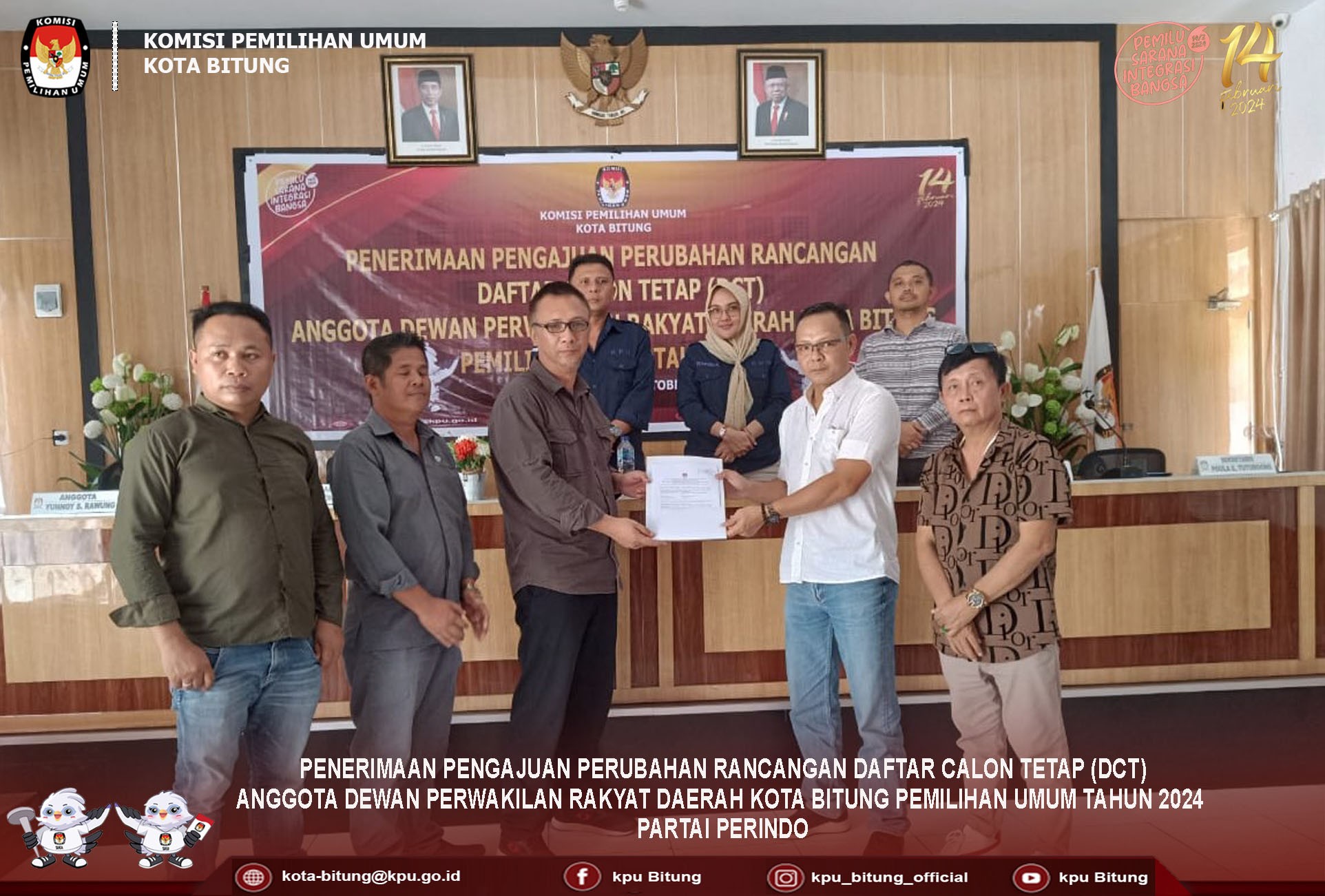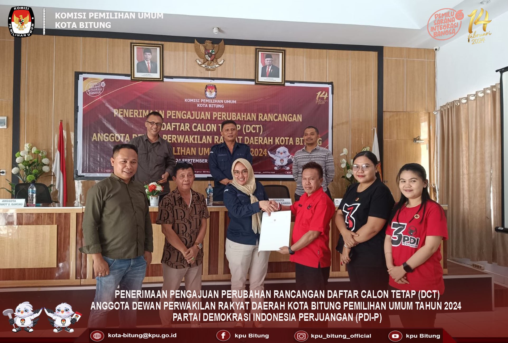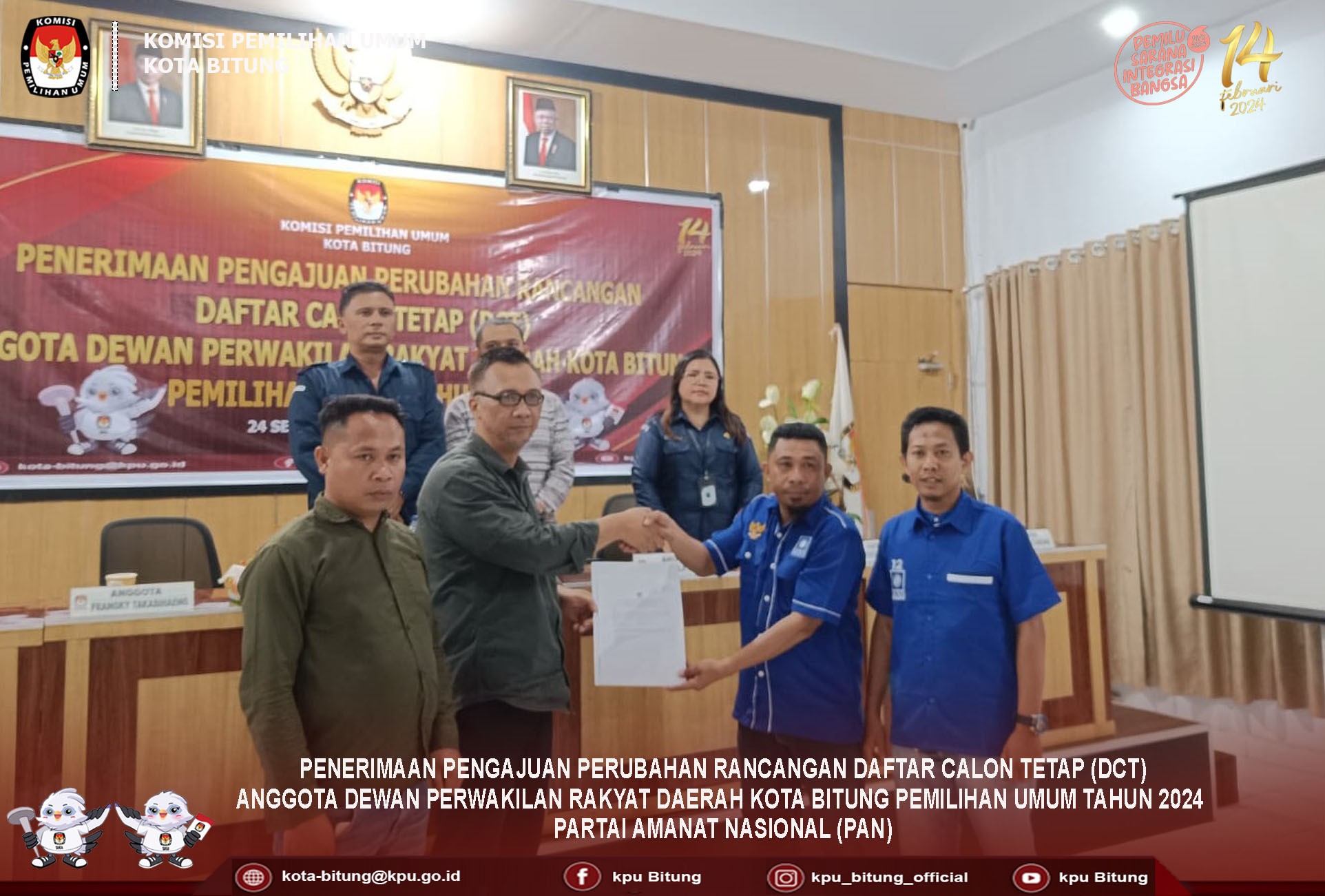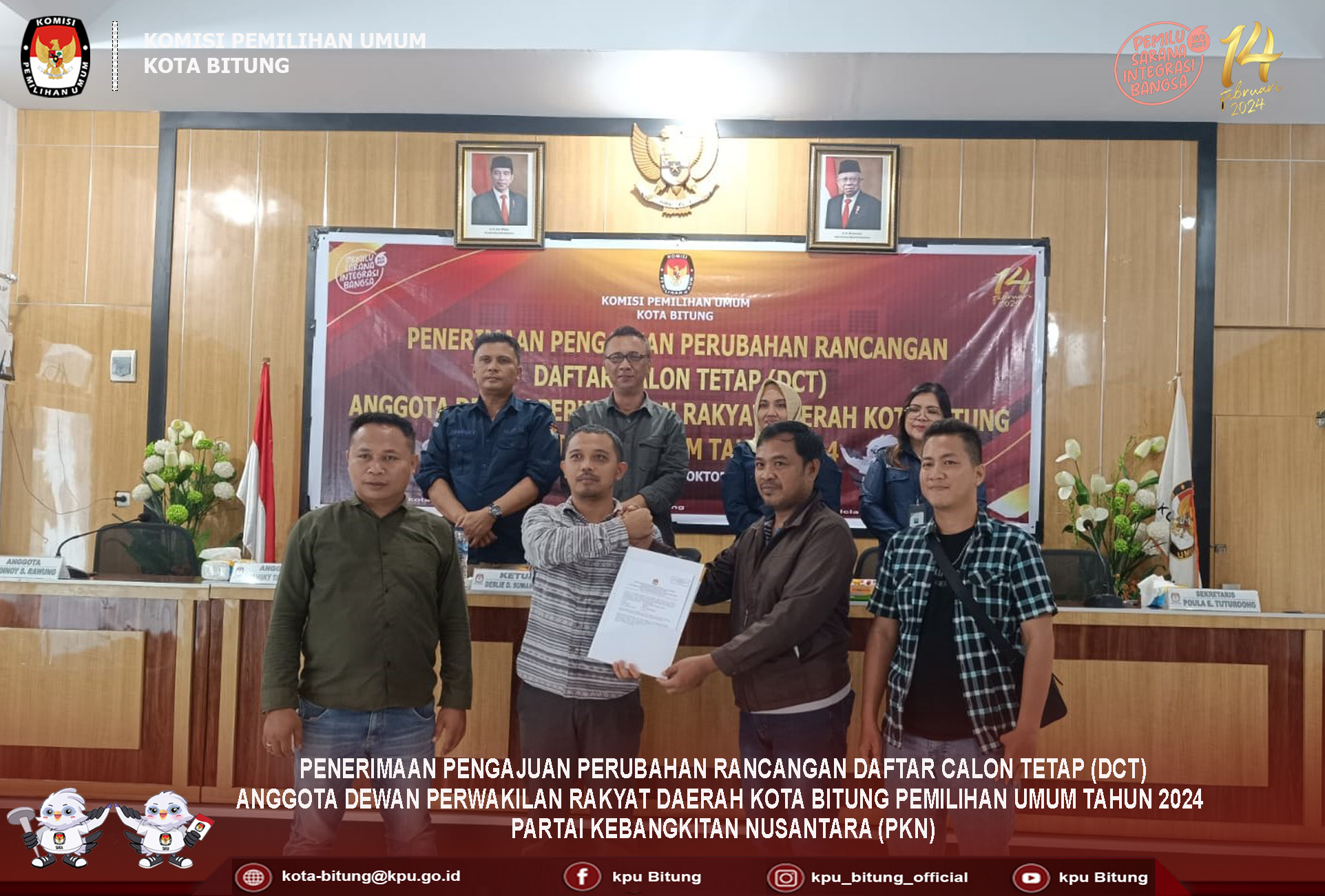 Bitung, kota-bitung.kpu.go.id, Bertempat di Aula Kantor KPU Kota Bitung, Selasa 2 Oktober 2023, Pukul 16.41 WITA, Komisi Pemilihan Umum menyambut kedatangan Partai Kebangkitan Nusantara (PKN) Kota Bitung untuk melakukan Pengajuan Perubahan Rancangan Daftar Calon Tetap (DCT) Anggota DPRD Kota Bitung Pemilihan Umum Tahun 2024. Pengajuan dilakukan oleh Ketua Partai Kebangkitan Nusantara (PKN) Kota Bitung Hendriya Kristiono dan diterima langsung oleh Ketua KPU Kota Bitung Deslie D. Sumampouw, didampingi oleh Anggota KPU Kota Bitung Yunnoy S. Rawung, Frangky Takasihaeng, Muhajir La Djanudin, Wiwinda Hamisi, dan Sekretaris KPU Kota Bitung Poula E. Tuturoong, serta didampingi oleh Anggota Bawaslu Kota Bitung Iten Kojongian dan Ahmad Syakur. Adapun status dari pengajuan yang dilakukan oleh Partai Kebangkitan Nusantara (PKN) Kota Bitung dinyatakan lengkap dan diterima. Partai Kebangkitan Nusantara (PKN) Kota Bitung merupakan partai kelima yang melakukan Pengajuan Perubahan Pencermatan Rancangan Daftar Calon Tetap (DCT) Anggota DPRD Kota Bitung Pemilihan Umum Tahun 2024. ke KPU Kota Bitung. #KPUMelayani #PemiluSerentak2024