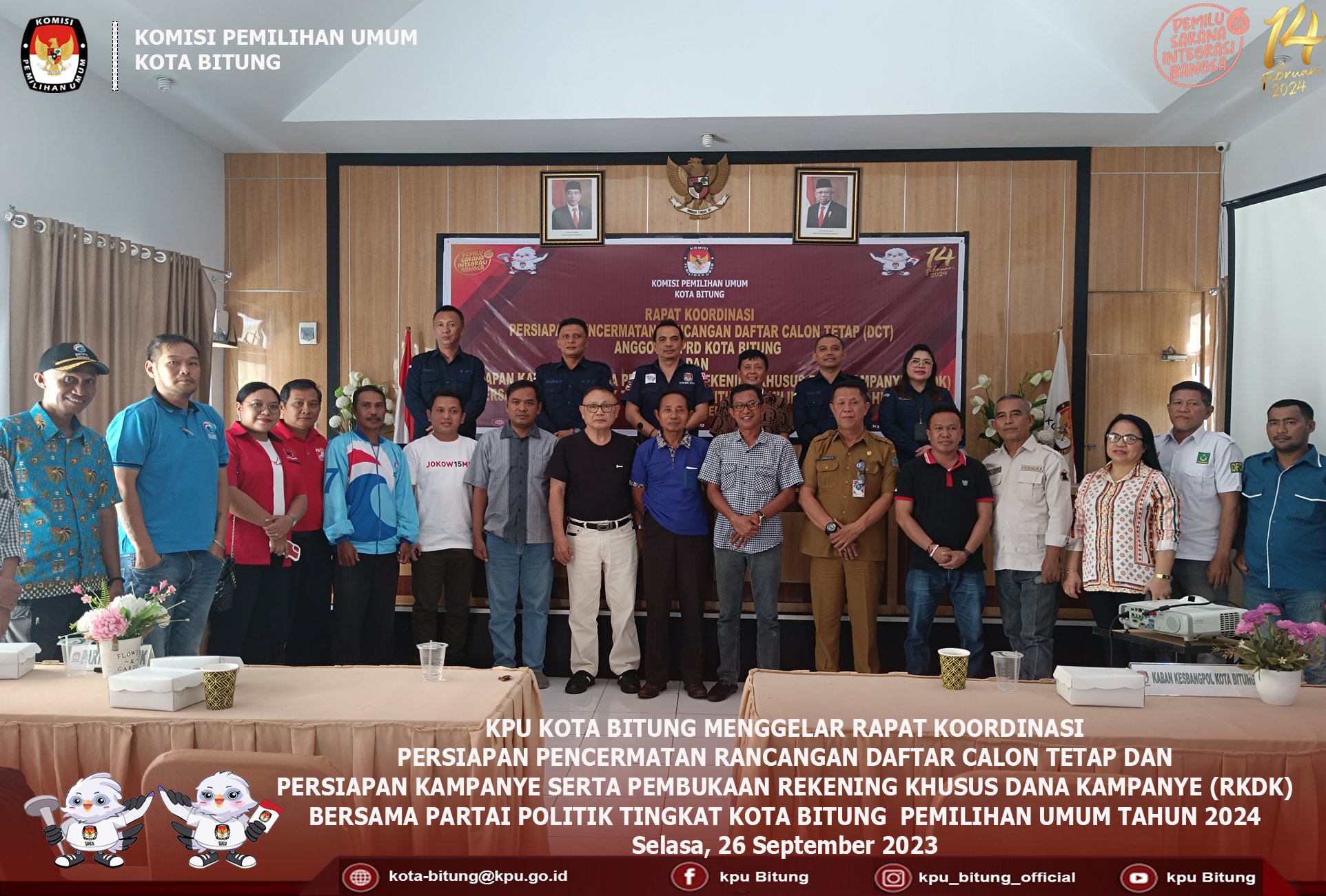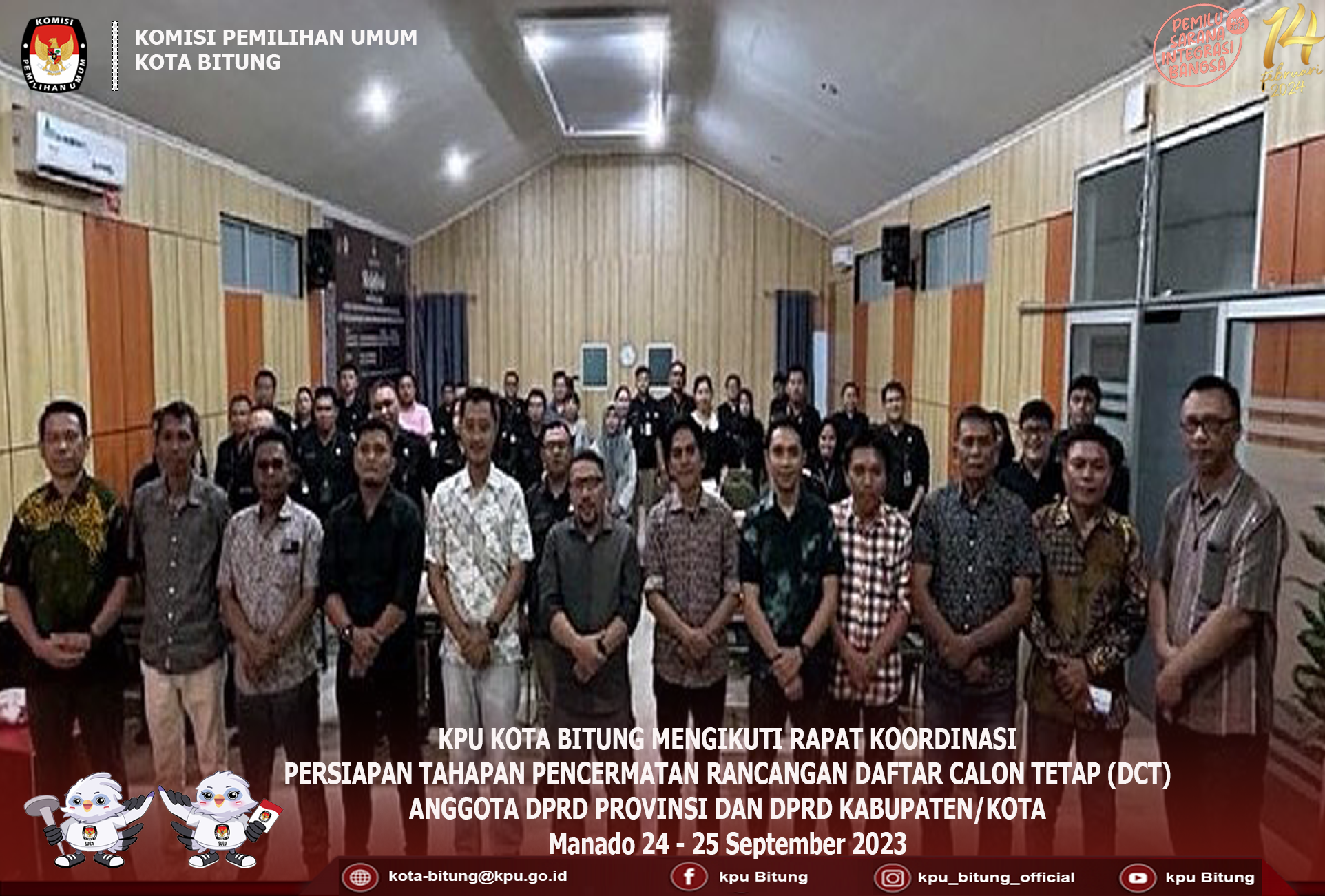 kota-bitung.kpu.go.id, KPU Kota Bitung dalam hal ini diwakili oleh Ketua Divisi Teknis Penyelenggaraan Yunnoy S. Rawung Dan Operator SILON Yohanis Takalamingan dan Meyorits Mandiangan, mengikuti Rapat Koordinasi Persiapan Tahapan Pencermatan Rancangan Daftar Calon Tetap (DCT) Anggota DPRD Provinsi dan Kabupaten/Kota, 24 - 25 September 2023, di Aula Kantor KPU Kota Manado.