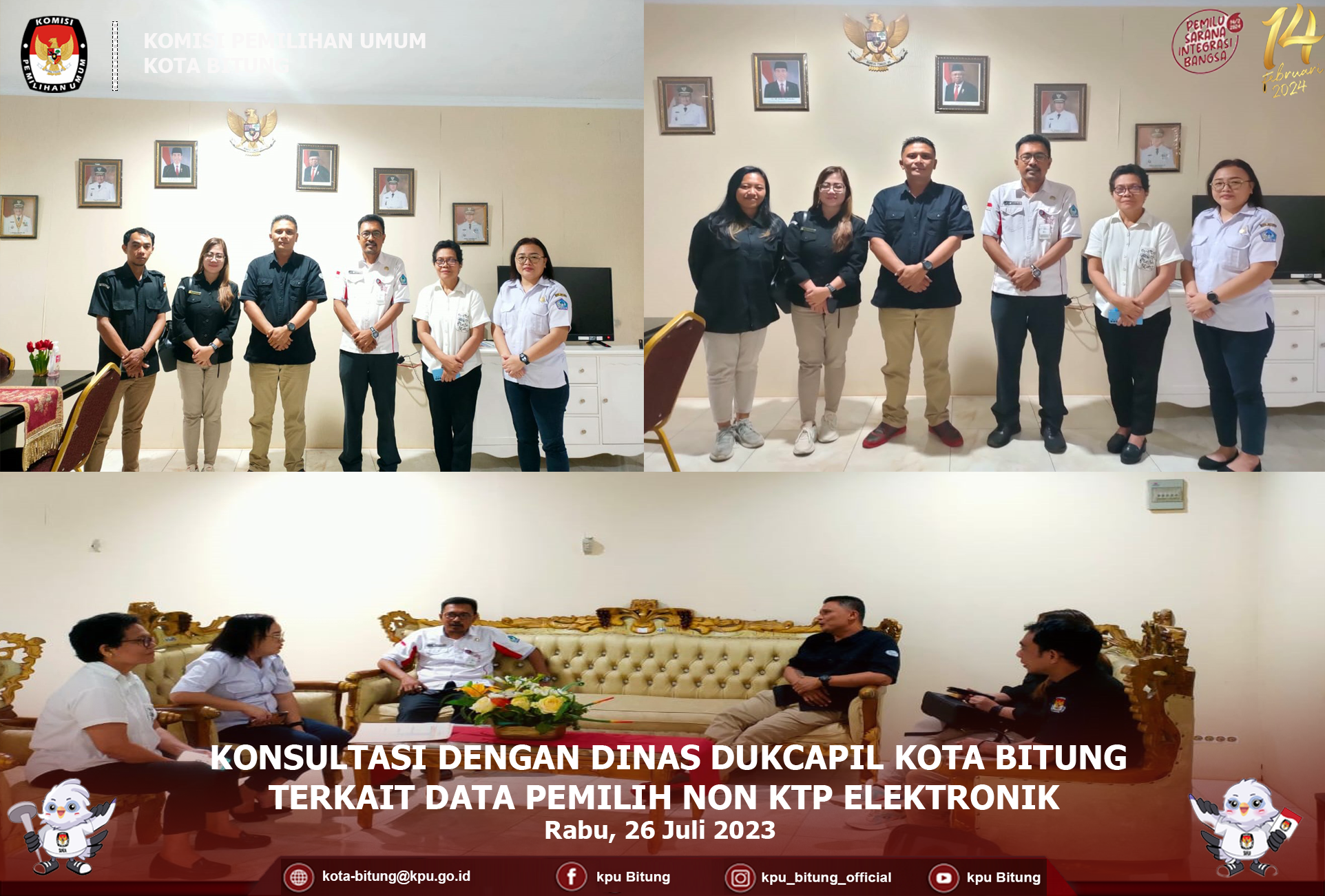 Bitung, 26 Juli 2023, Pukul 13:00 WITA, bertempat di Kantor Dinas Kependudukan dan Pencatatan Sipil Kota Bitung, KPU Kota Bitung Melakukan Konsultasi dengan Dinas Dukcapil Kota Bitung terkait data pemilih Non KTP Elektronik.