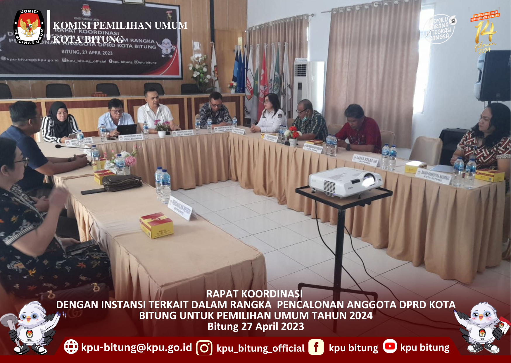 Kamis, 27 April 2023, Pukul 14:00 Wita, bertempat di aula KPU Kota Bitung, KPU Kota Bitung Melakukan Rapat Koordinasi dengan instansi terkait dalam rangka pencalonan Anggota DPRD Kota Bitung Untuk Pemilihan Umum Tahun 2024.