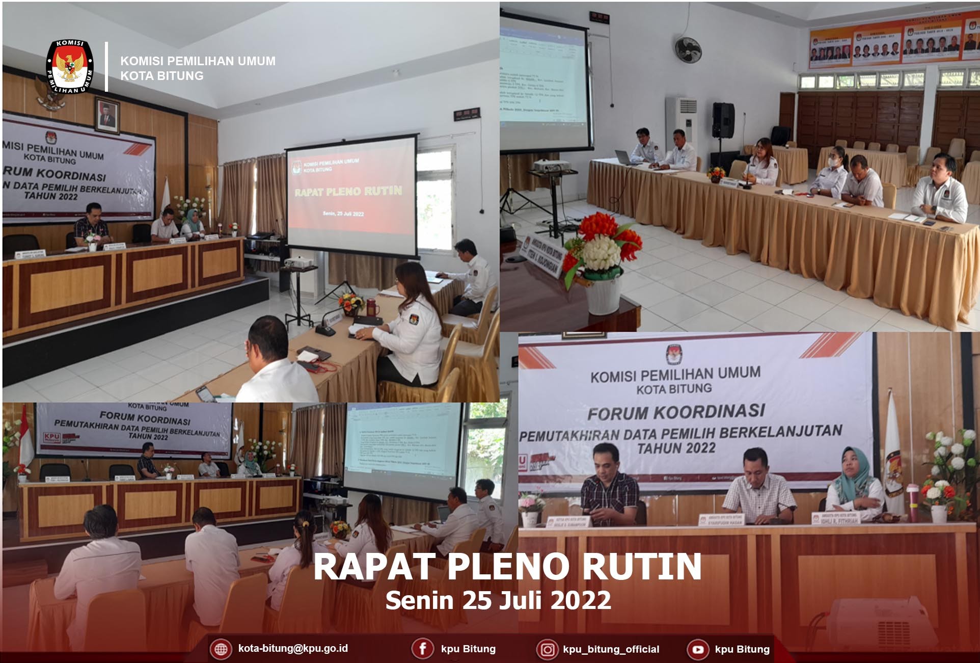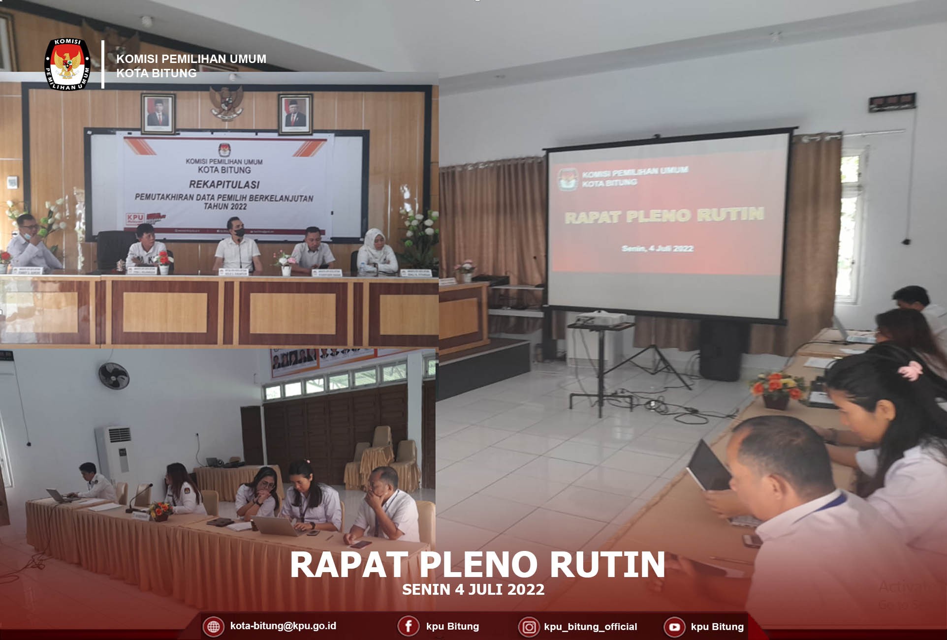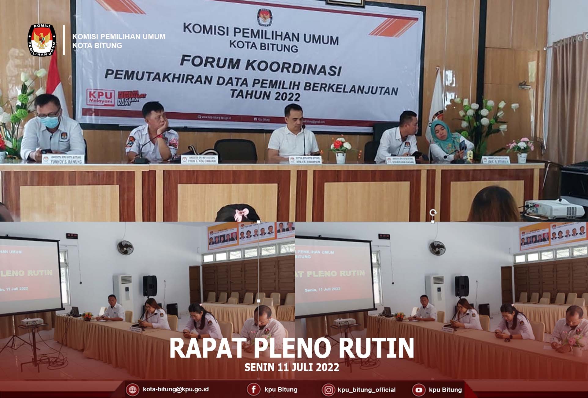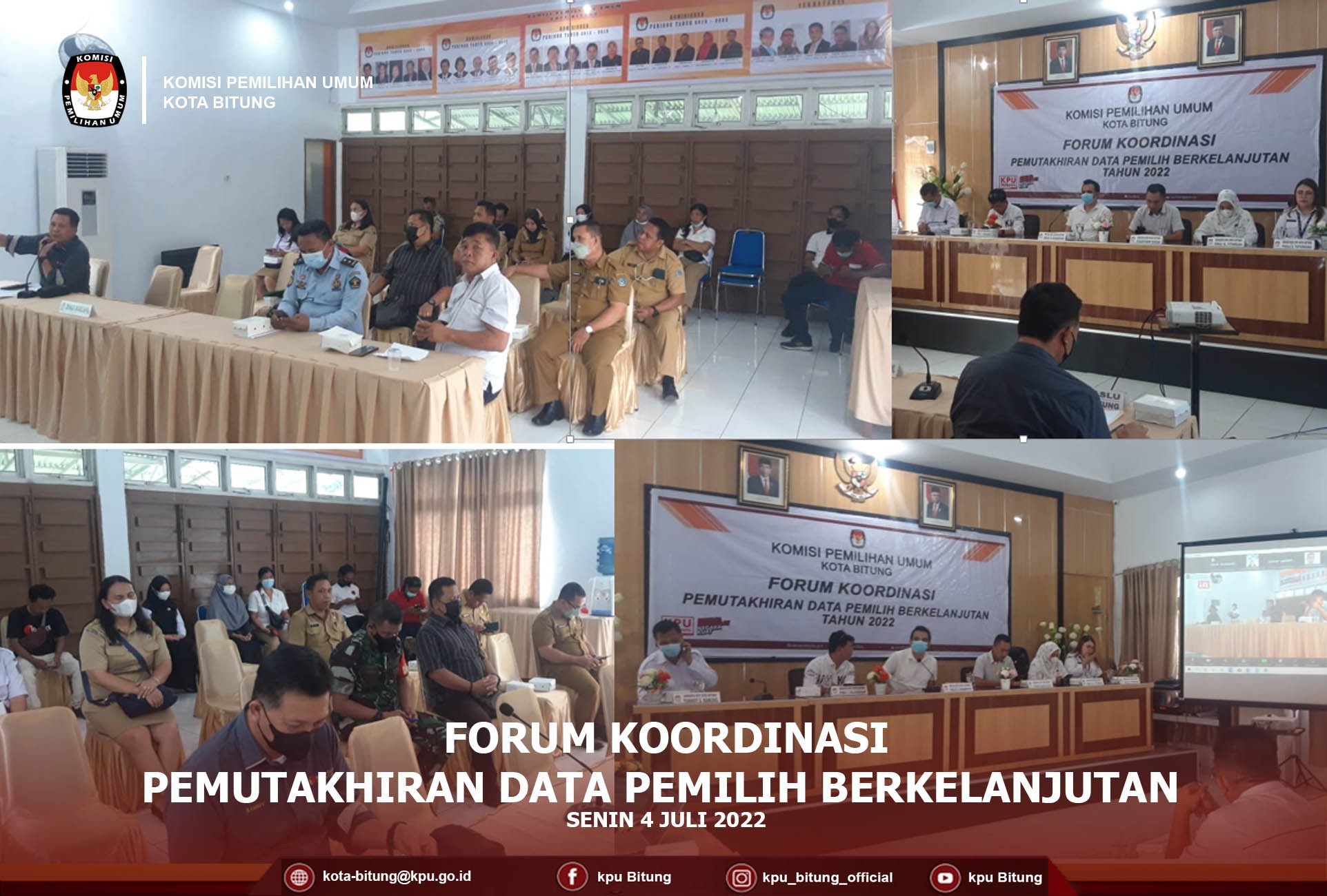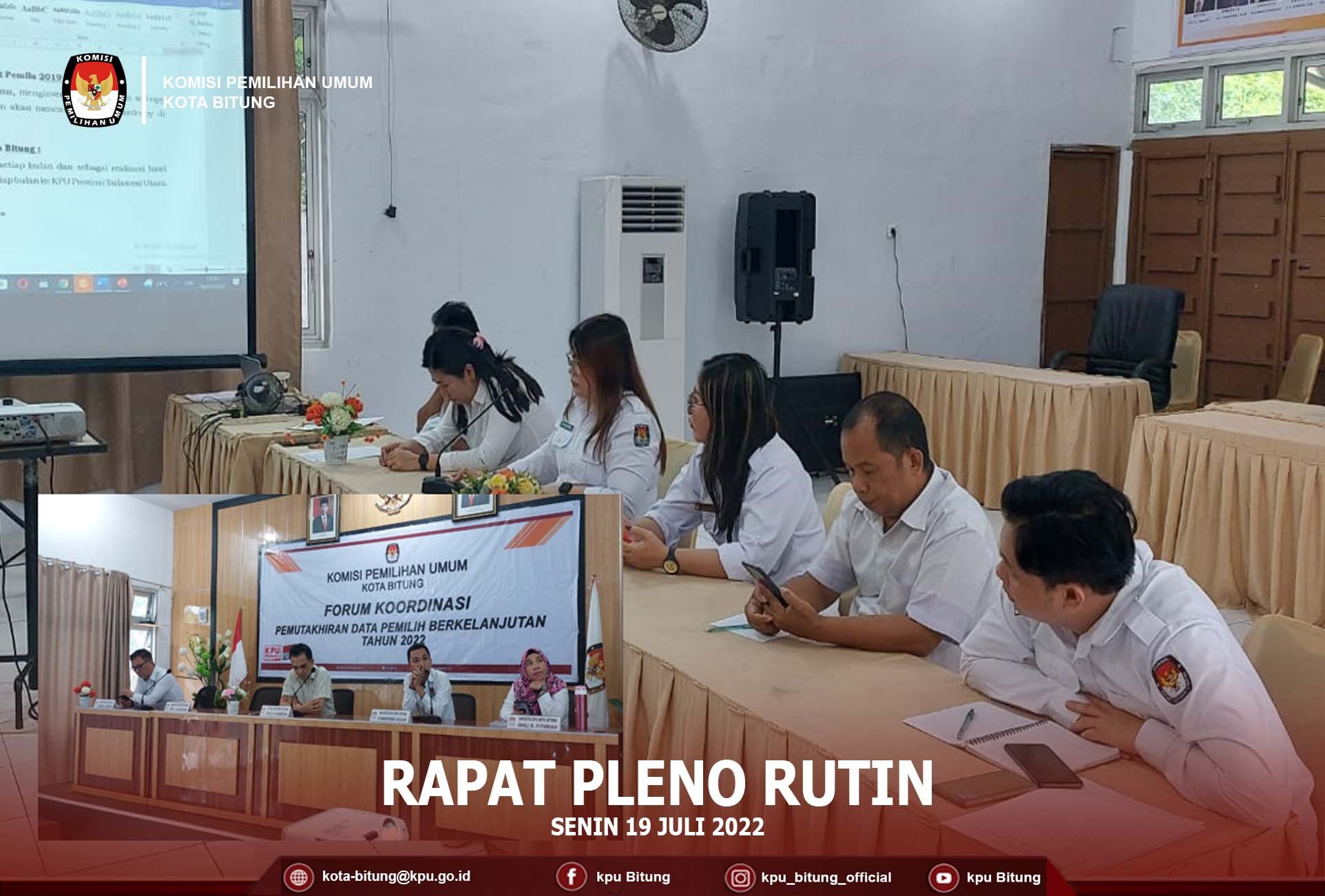 KPU Kota Bitung melaksanakan Forum Koordinasi PDPB Periode Bulan April s/d Juni Tahun 2022 dan Rekapitulasi PDPB Periode Bulan Juni Tahun 2022 lewat daring via zoom meeting dengan lurah - lurah se-Kota Bitung dan luring yang dihadiri oleh Dinas Dukcapil Kota Bitung, Lapas Klas IIB Kota Bitung, Bawaslu Kota Bitung dan Camat-camat Se-Kota Bitung.