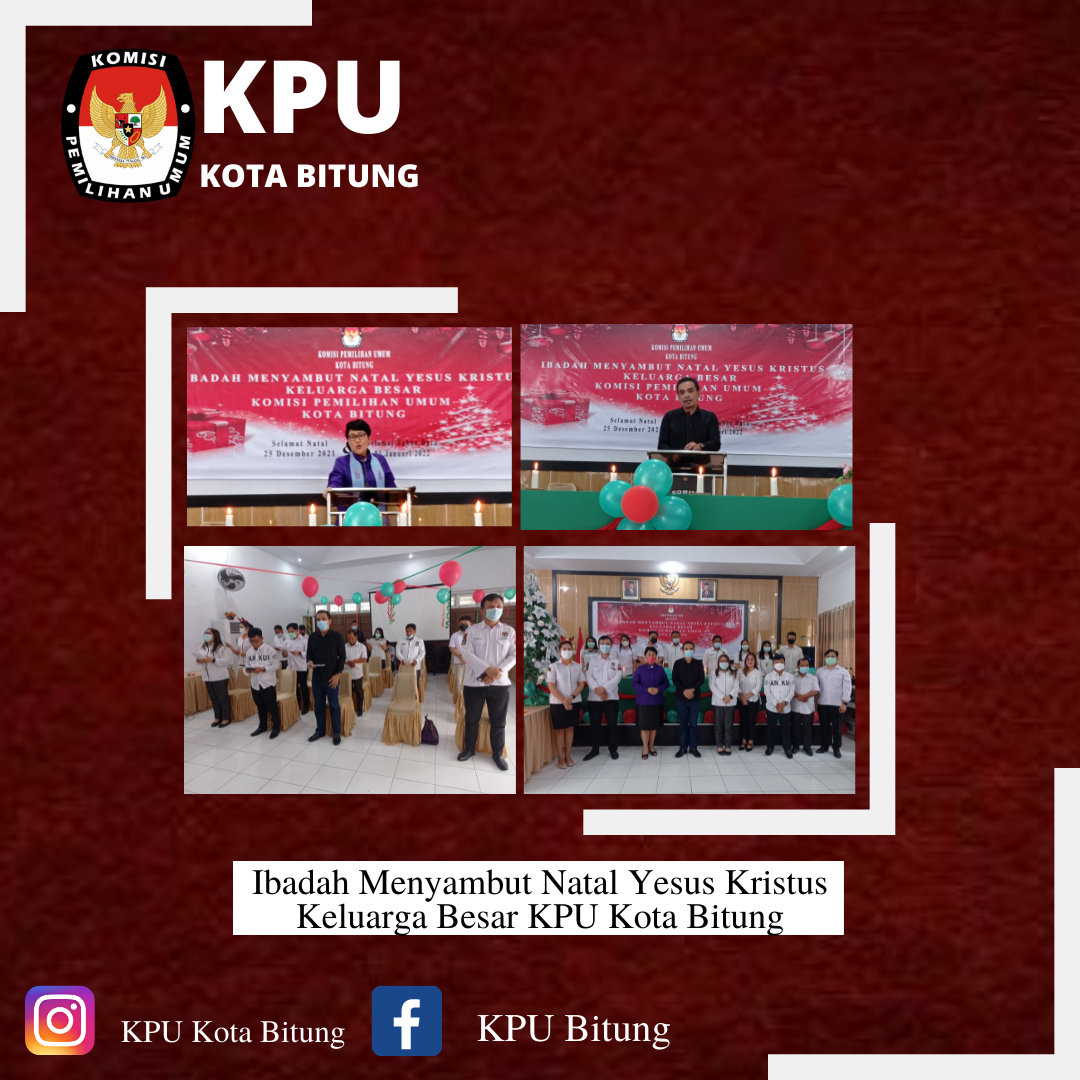Senin, 20 Desember 2021, dalam memperingati hari kelahiran Tuhan Yesus Kristus, Komisi Pemilihan Umum Kota Bitung, Menggelar Ibadah Menyambut Natal Yesus Kristus, Yang di laksakan pada Pukul 13 : 00 Wita, Bertempat Di Aula KPU Kota Bitung, Ibadah ini diikuti oleh seluruh keluarga besar KPU Kota Bitung, ibadah ini di pimpin langsung oleh yang terkasih pdt. Itha Umboh.MTh.