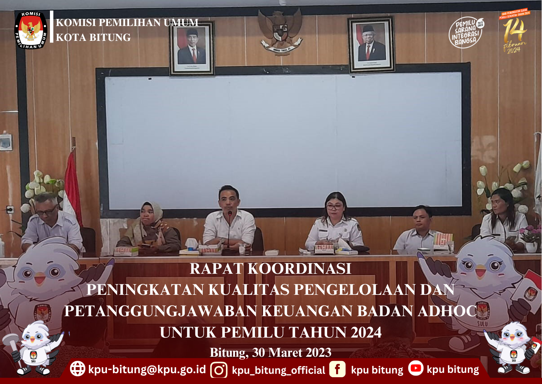 Kamis, 30 Maret 2023, pukul 16:00, bertempat di Aula KPU Kota Bitung, KPU Kota Bitung melakukan kegiatan Rapat Koordinasi Peningkatan Kualitas Pengelolaan Dan Pertanggungjawaban Keuangan Badan Adhoc Untuk Pemilu Tahun 2024.