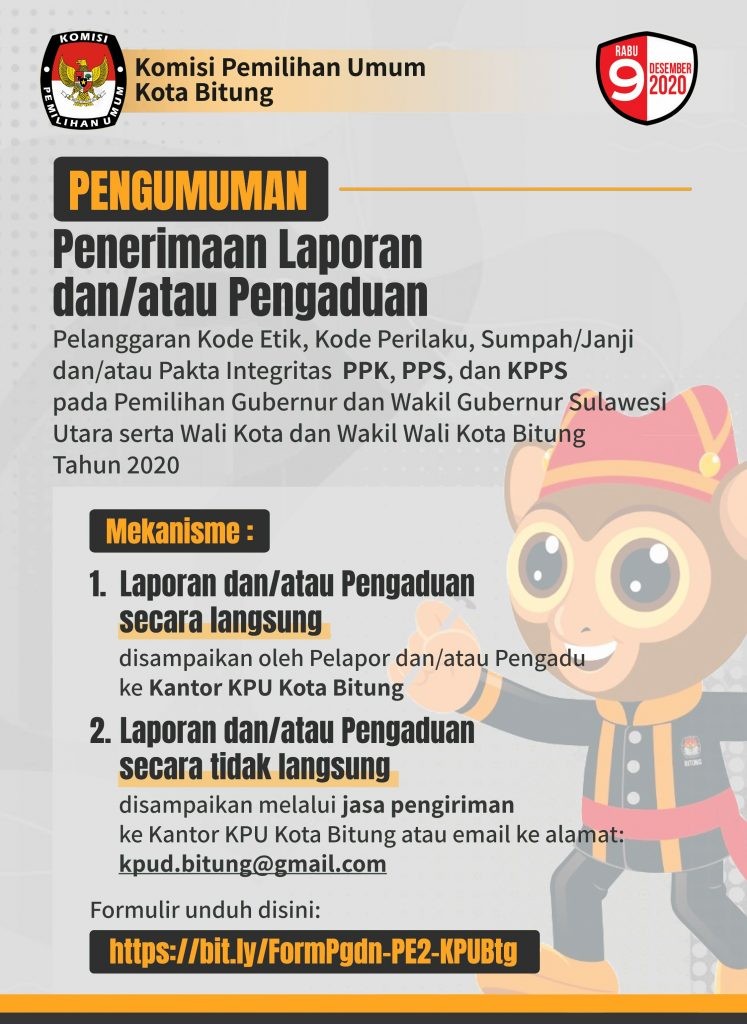Memerhatikan ketentuan pasal 53 Peraturan Komisi Pemilihan Umum Nomor 19 Tahun 2020 tentang Perubahan Atas Peraturan Komisi Pemilihan Umum Nomor 9 Tahun 2018 tentang Rekapitulasi Hasil Penghitungan Suara dan Penetapan Hasil Pemilihan Gubernur dan Wakil Gubernur, Bupati dan Wakil Bupati, dan/ atau Wali Kota dan Wakil Wali Kota, Peraturan Komisi Pemilihan Umum Republik Indonesia Nomor 5 Tahun 2020 Tentang Perubahan Ketiga Atas Peraturan Komisi Pemilihan Umum Nomor 15 Tahun 2019 Tentang Tahapan, Program Dan Jadwal Penyelenggaraan Pemilihan Gubernur Dan Wakil Gubernur, Bupati Dan Wakil Bupati, Dan/Atau Wali Kota Dan Wakil Wali Kota Tahun 2020, maka berdasarkan Berita Acara Nomor 03/PL.03.7-BA/7172/Kota/I/2021 Tentang Rapat Pleno Terbuka Penetapan Pasangan Calon Wali Kota danWakil Wali Kota Bitung Terpilih Pada Pemilihan Tahun 2020 serta Keputusan Komisi Pemilihan Umum Kota Bitung Nomor 01/Pl.02.7-Kpt/7172/Kota/I/2021 Tentang Penetapan Pasangan Calon Wali Kota dan Wakil Wali Kota Bitung Terpilih Pada Pemilihan Tahun 2020, dengan ini diumumkan bahwa Pasangan Calon Wali Kota dan Wakil Wali Kota Bitung Terpilih pada Pemilihan Tahun 2020 adalah Pasangan Calon Nomor Urut 3 (tiga) atas nama Ir.Maurits Mantiri, MM dan Hengky Honandar, SE dengan perolehan suara sebanyak 67.308 (Enam Puluh Tujuh Ribu Tiga Ratus Delapan). Berita acara download link Pengunguman download link Surat Keputusan KPU Bitung : download link