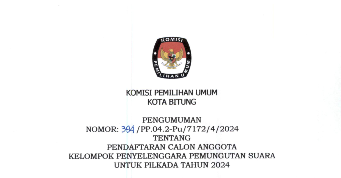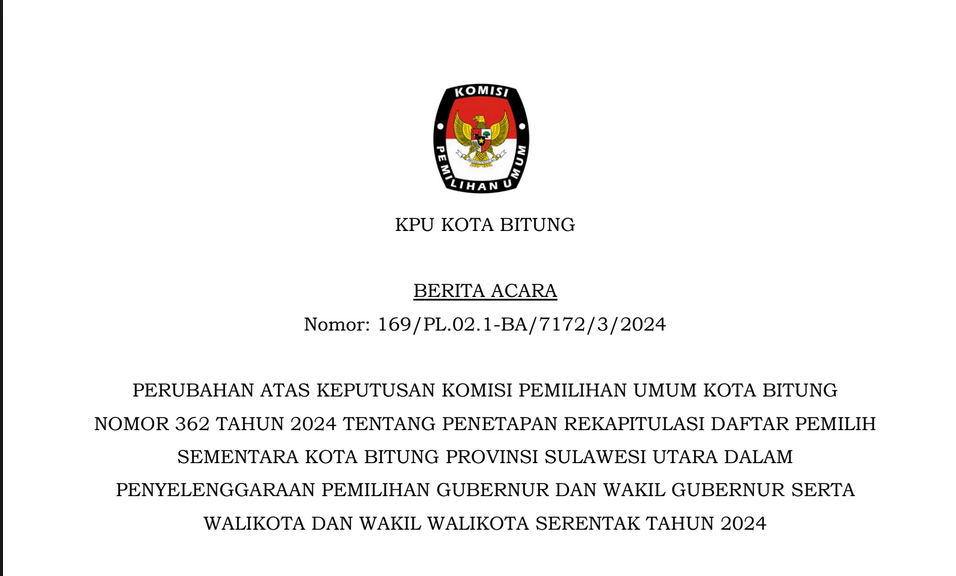 Daftar Pemilih Sementara (DPS) Kota Bitung Pemilihan Serentak Tahun 2024 Berdasarkan Berita Acara Perubahan dan SK Perubahan,