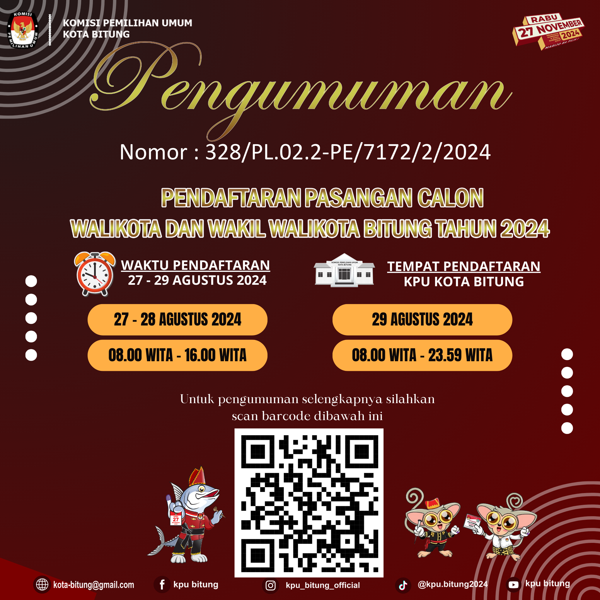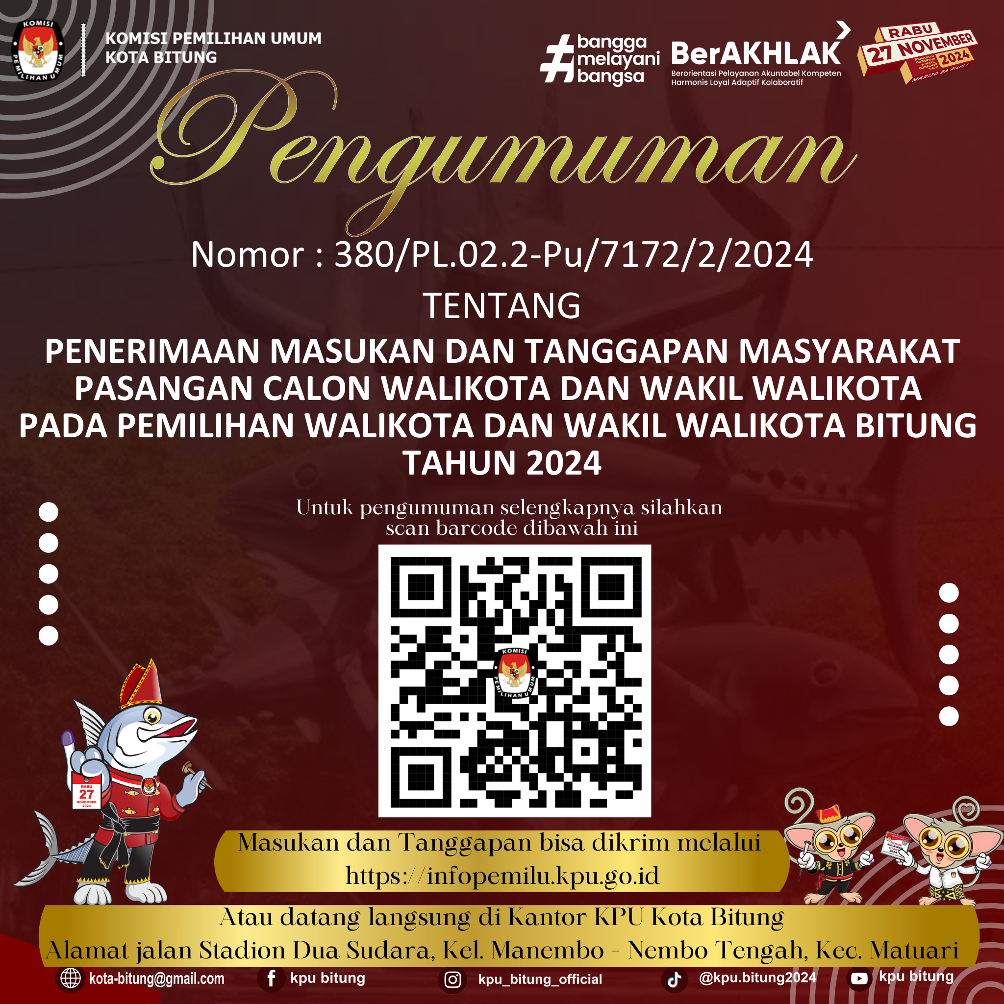 Silakan mengecek nama anda apakah sudah terdaftar sebagai Pemilih. Jika ada masukan atau tanggapan terhadap DPS bisa menghubungi secara langsung PPS/PPK setempat atau mengunjungi Kantor KPU Kota Bitung mulai tanggal 18 s.d 27 Agustus 2024.