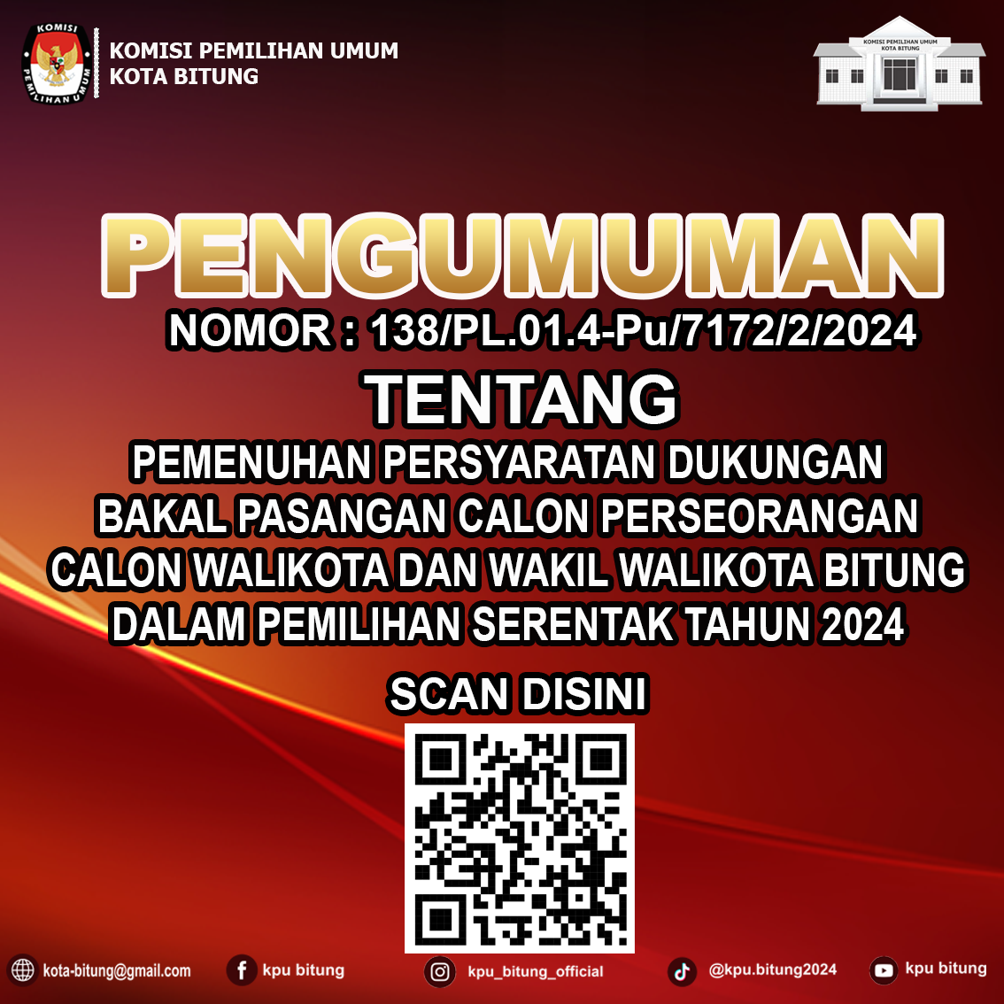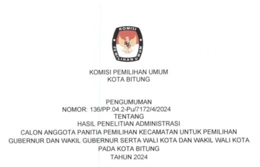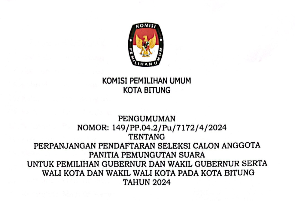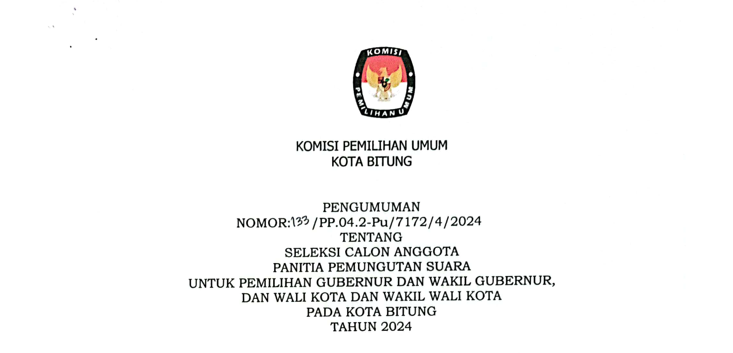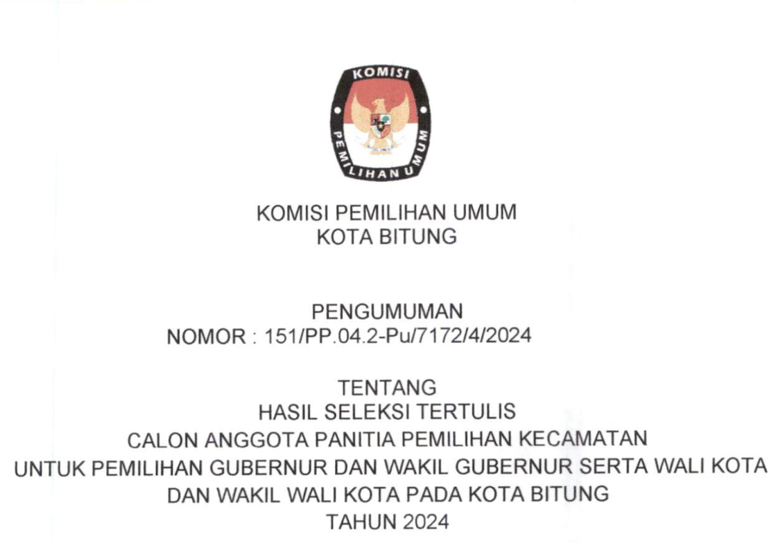 Komisi Pemilihan Umum Kota Bitung telah melaksanakan tahapan Seleksi Tertulis Calon Anggota Panitia Pemilihan Kecamatan pada Kota Bitung untuk Pemilihan Gubemur dan Wakil Gubemur dan Wali Kota dan Wakil Wali Kota Tahun 2024, disampaikan beberapa hal sebagai berikut: