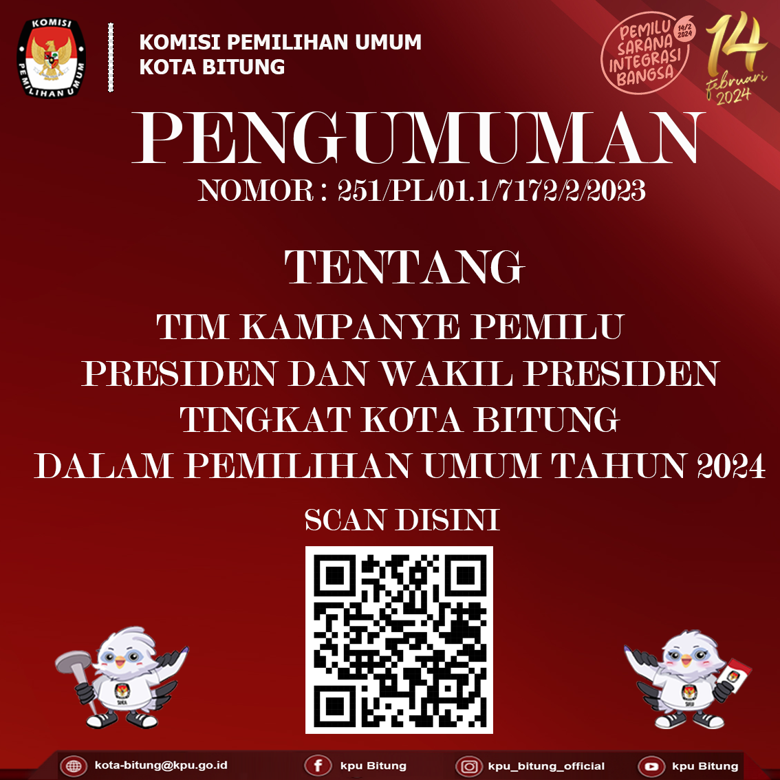 Berikut ini adalah Pengumuman Nomor : 251/PL.01.1/7172/2/2023 Tentang Tim Kampanye Pemilihan Umum Presiden dan Wakil Presiden Tingkat Kota dalam Pemilihan Umum Tahun 2024 KLIK DISINI