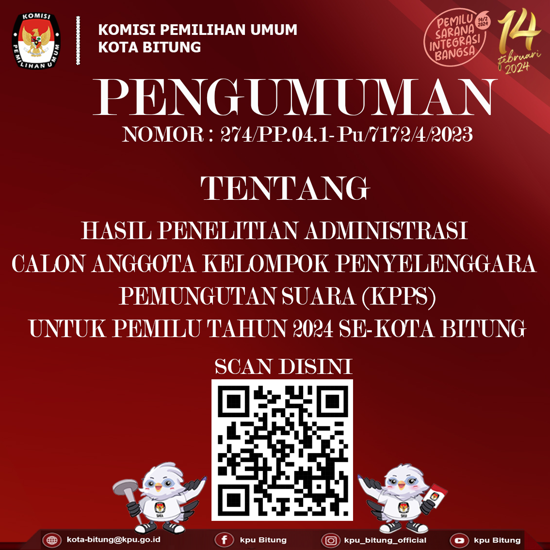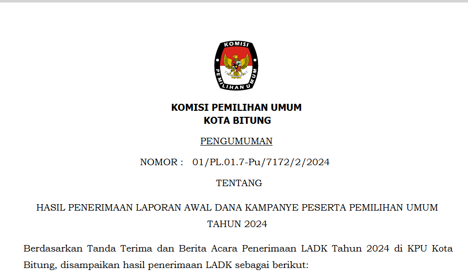 Teman Pemilih Berikut Pengumuman Nomor:274/PP.04.1-Pu/7172/4/2023 Tentang Hasil Penelitian Administrasi Calon Anggota KPPS Untuk Pemilu Tahun 2024 Se-Kota BitungKlik Disini